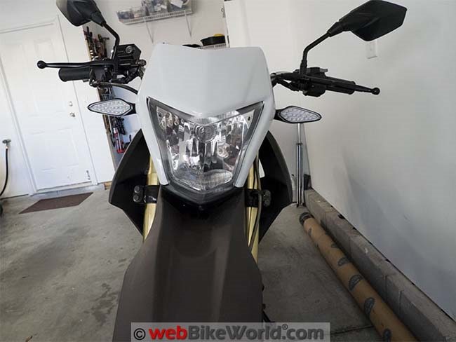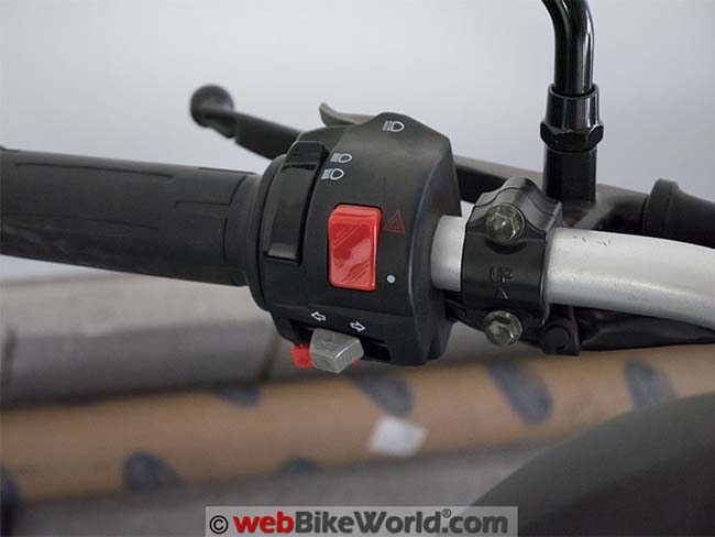 A 35 Watt H4 halogen bulb rests in the headlight nacelle, which has a modern naked street bike look. It’s not bad looking, but I keep thinking I would like to just stick a round 7” headlight in its place.