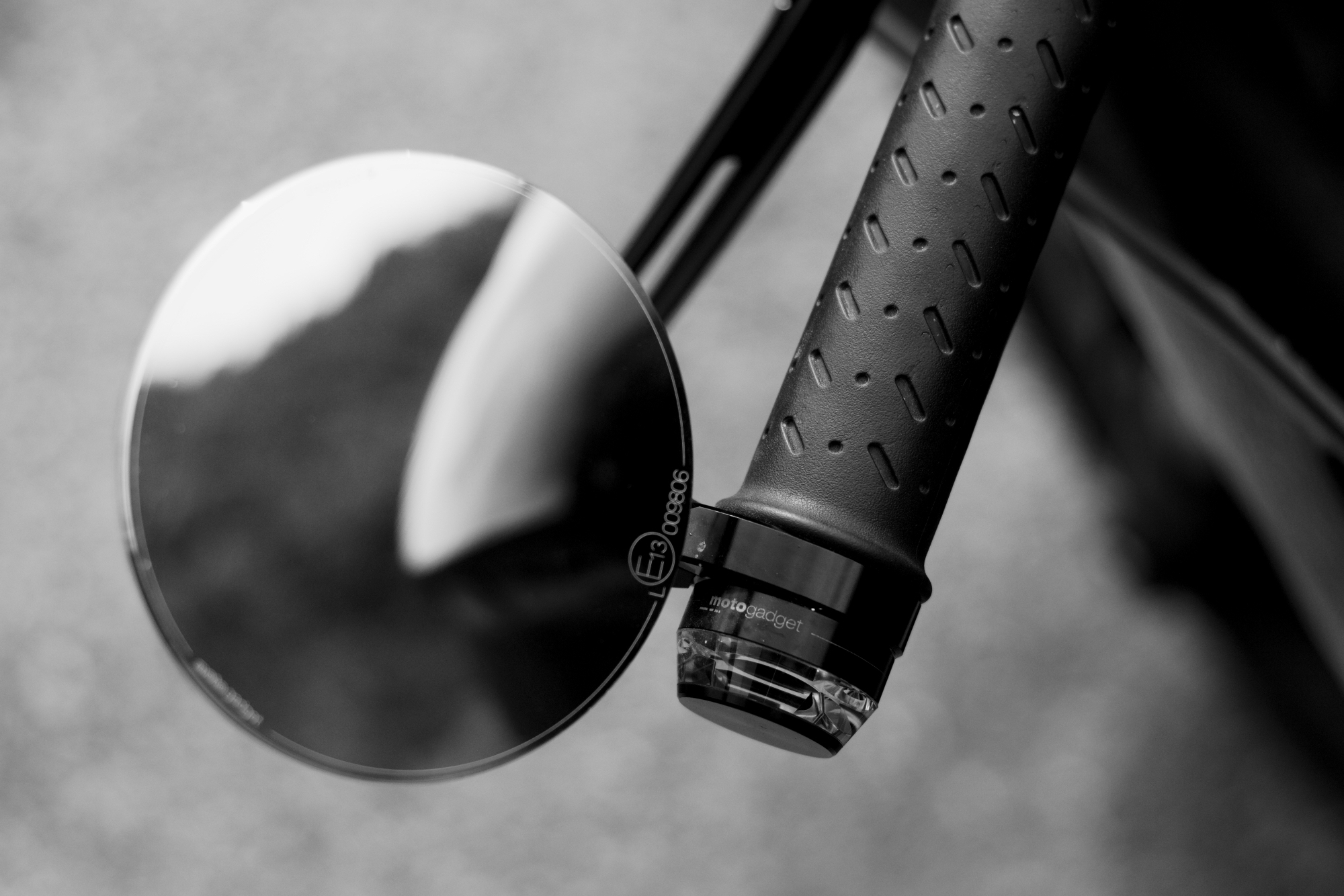 Though the chassis and suspension stay squeaky clean and original to the Triple, Tumulte has added bar-end LED indicators and mirrors add to the gorgeous custom leather seat and tail tidy (the latter of which we are particularly grateful for).