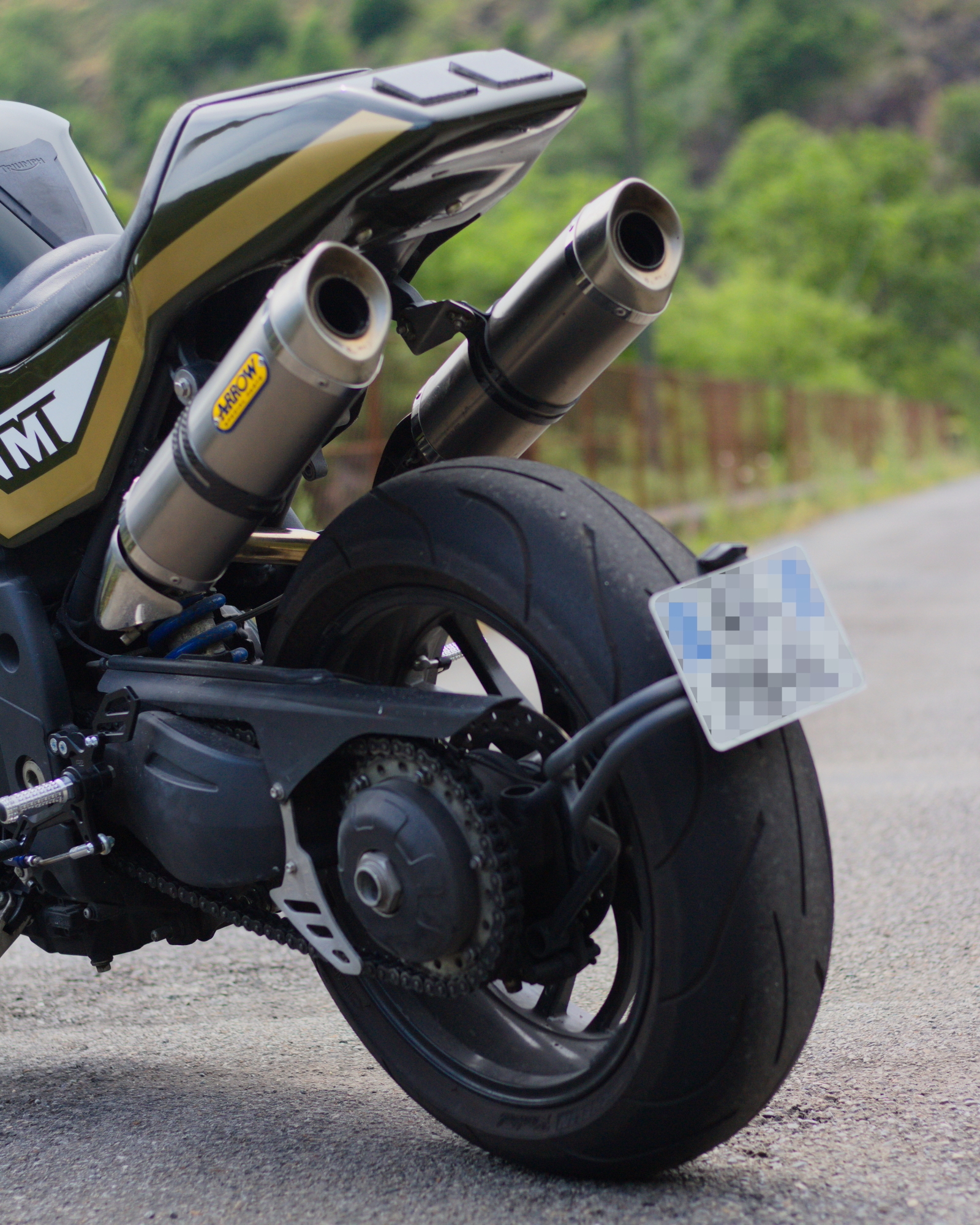 On to the innards; Top Speed tells us that the singular handlebar has been ditched in favour of a set of low clip-ons, custom rear sets, and a beauty twin Arrow exhaust.
