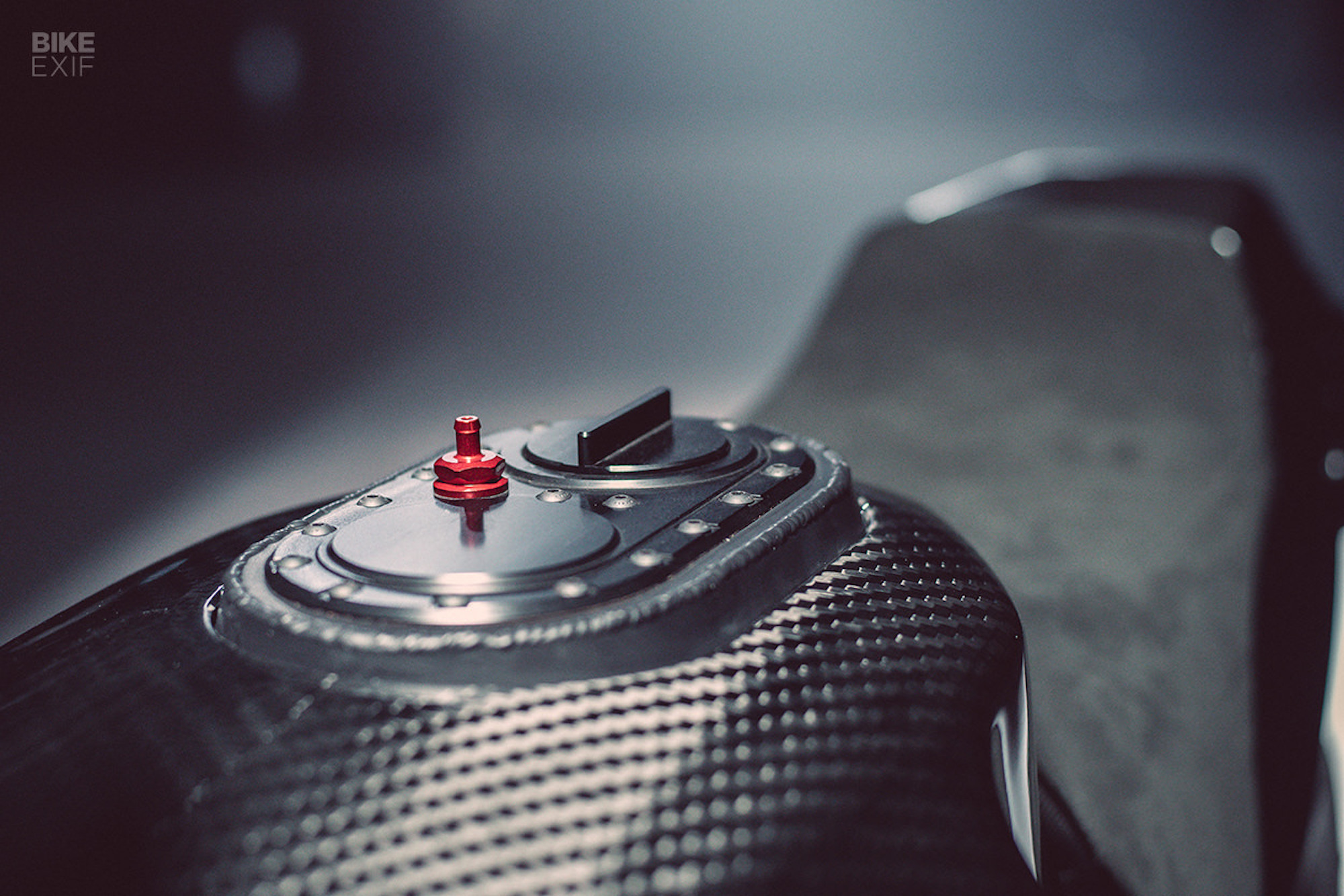Using the expert talents of Vinco Racing, Brice enlisted all relevant aids to get new yokes and chassis reinforcement plates, as well as “a hidden aluminum fuel cell, a one-off belly pan, and a custom made swingarm” in under the stunning 4lb carbon bodywork.