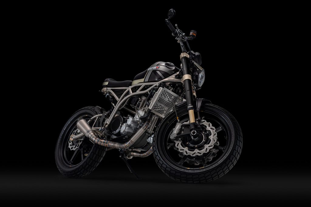 With 20kg taken off the machine thanks to the new super-lightweight 3Al/2.5V CWSR aerospace-grade titanium frame, the dry weight is now clocked at a mere 136kg (299lb) with change to spare (and it still holds a 600cc single-cylinder pea-shooter, punching out a very caffeinated 63hp. That’s “a higher power-to-weight figure than a Lamborghini Aventador”).