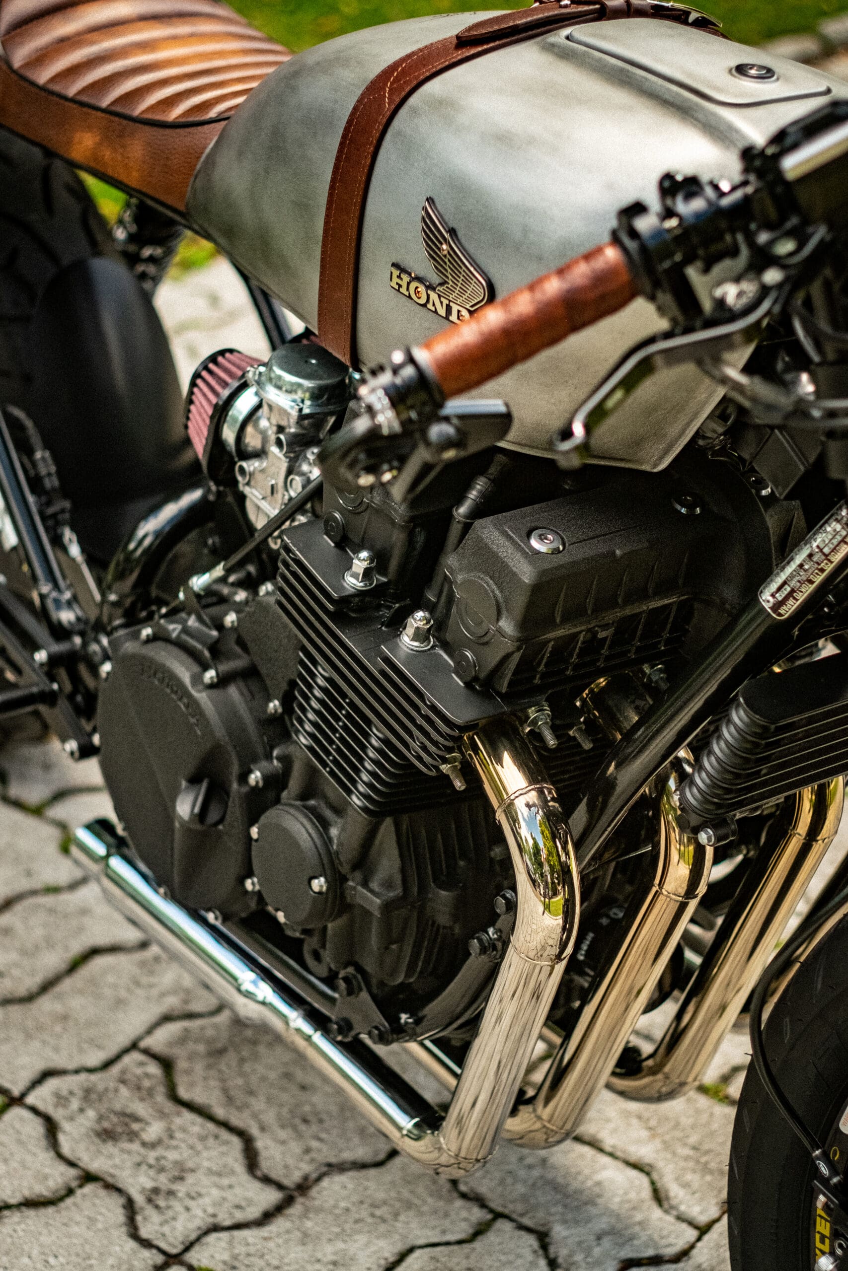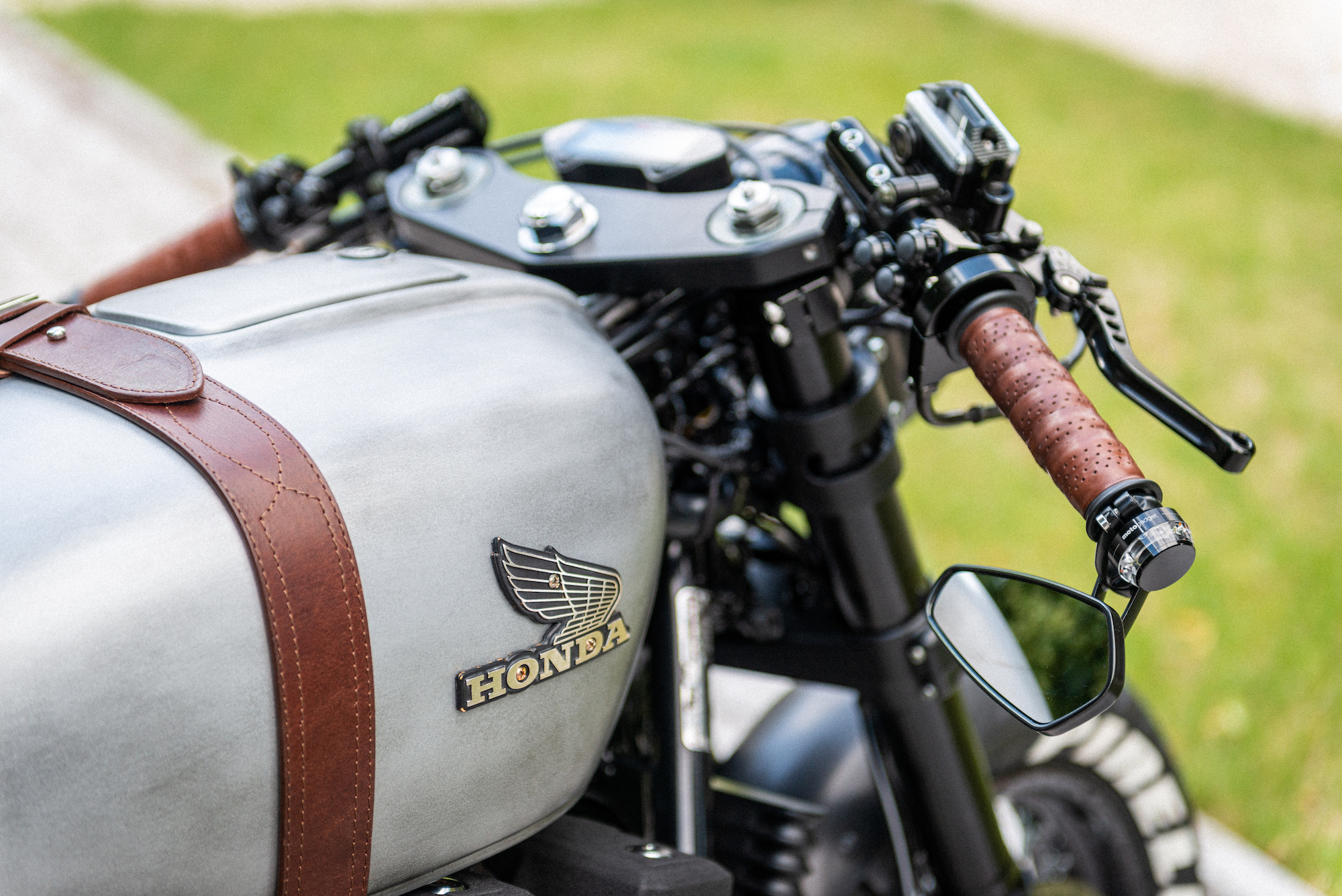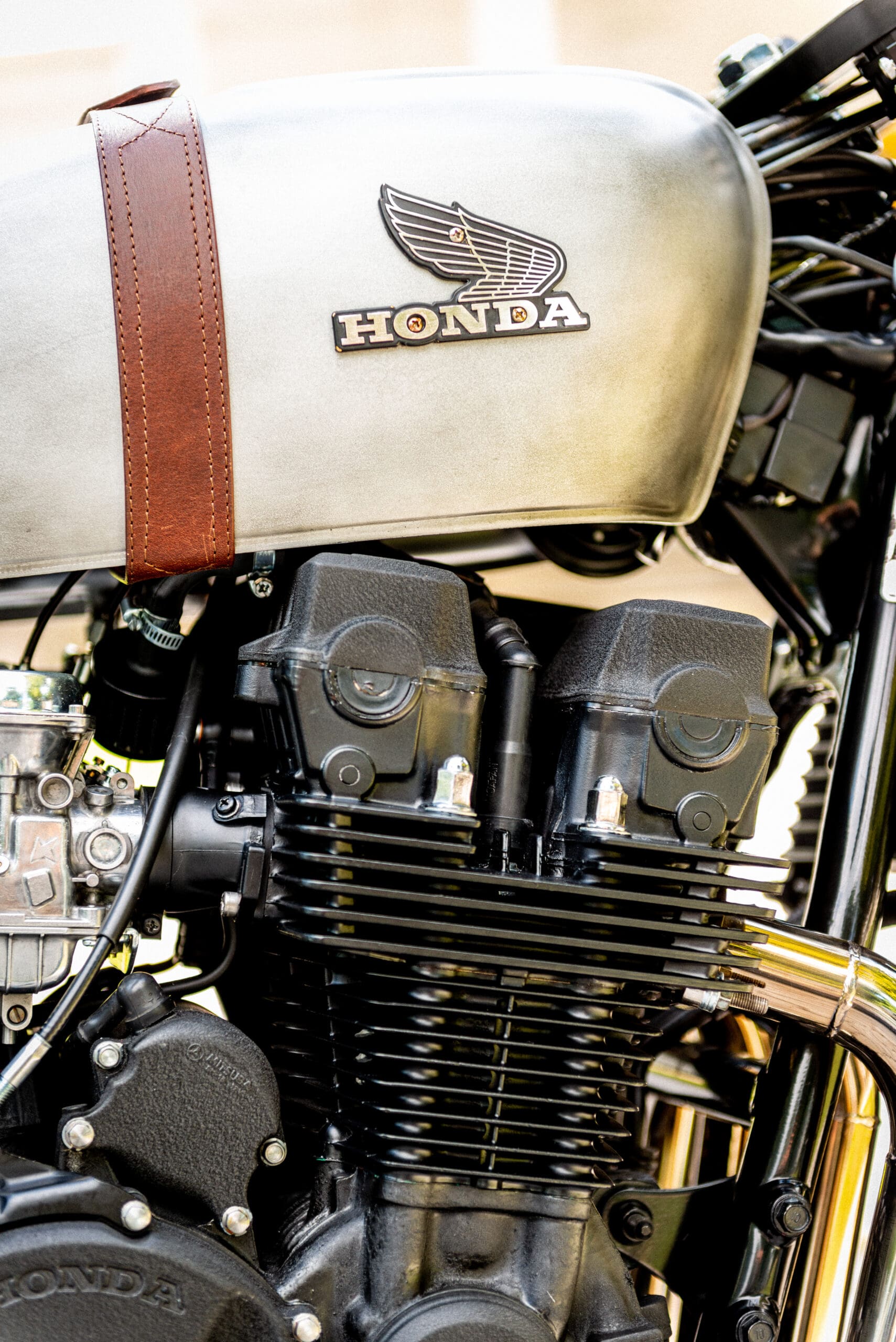 The tank from a 1976 Honda CB 550F was borrowed to lend a hand to the ‘retro’ vibe – further cemented by a (painted) old steel effect, a matte top coat, and thick leather straps over the hump to act as a tank belt.