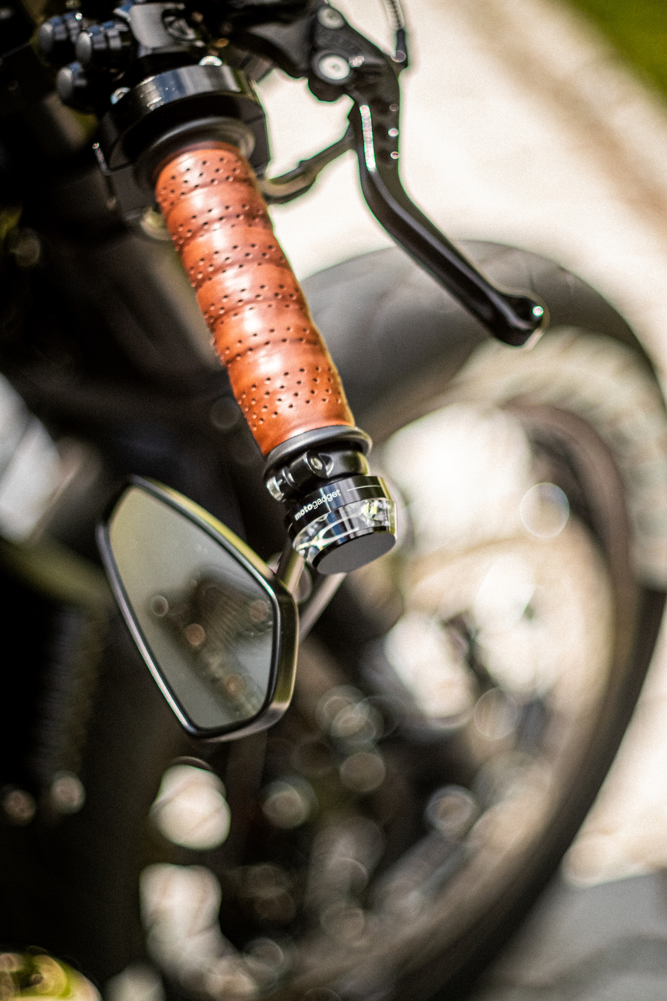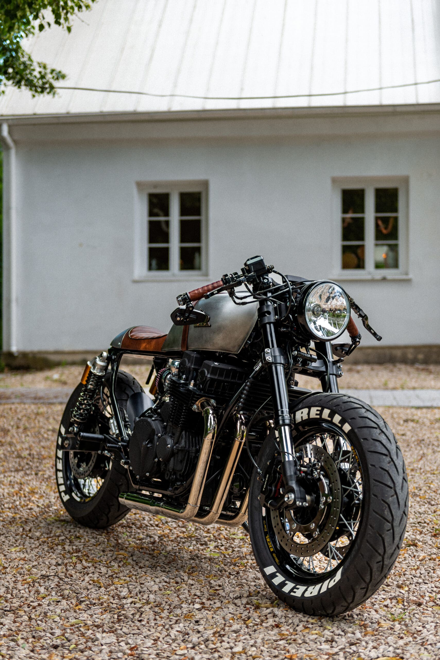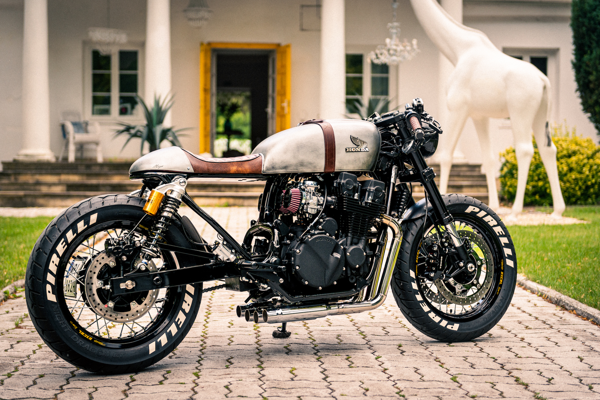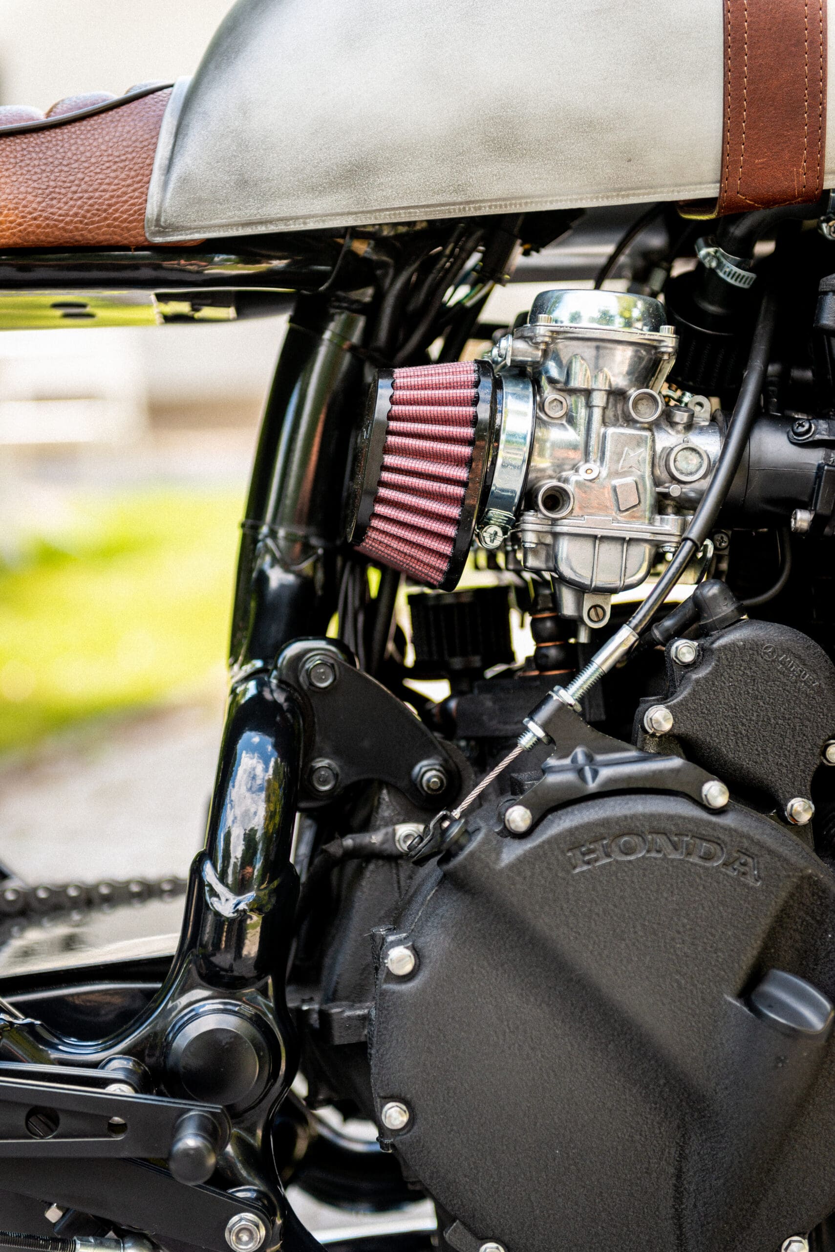 The tank from a 1976 Honda CB 550F was borrowed to lend a hand to the ‘retro’ vibe – further cemented by a (painted) old steel effect, a matte top coat, and thick leather straps over the hump to act as a tank belt.