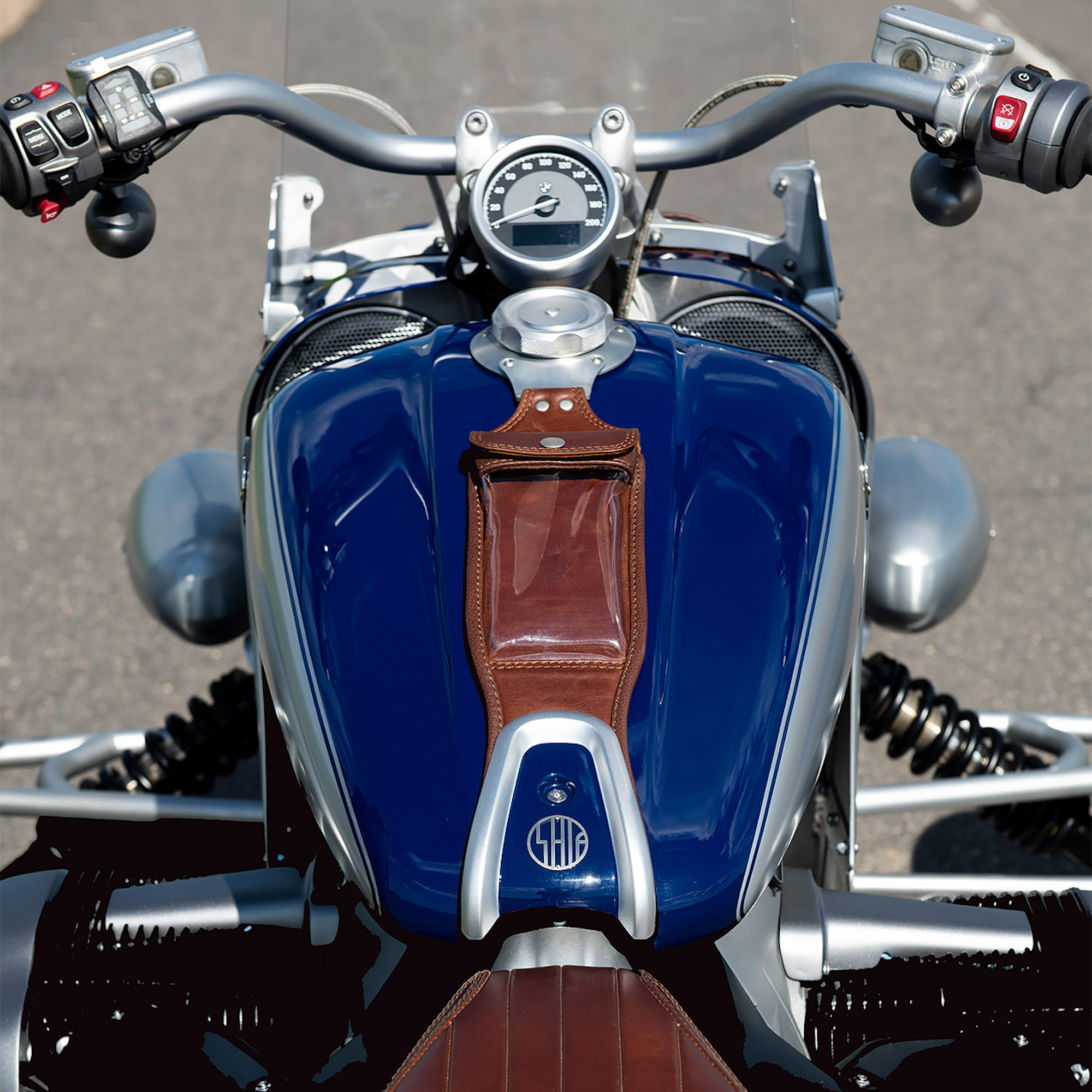 More interesting yet is the rider’s view; Bluetooth sits in the bike’s new schnoz, while a leather pouch on top of the fuel tank and hood straps tie everything together.