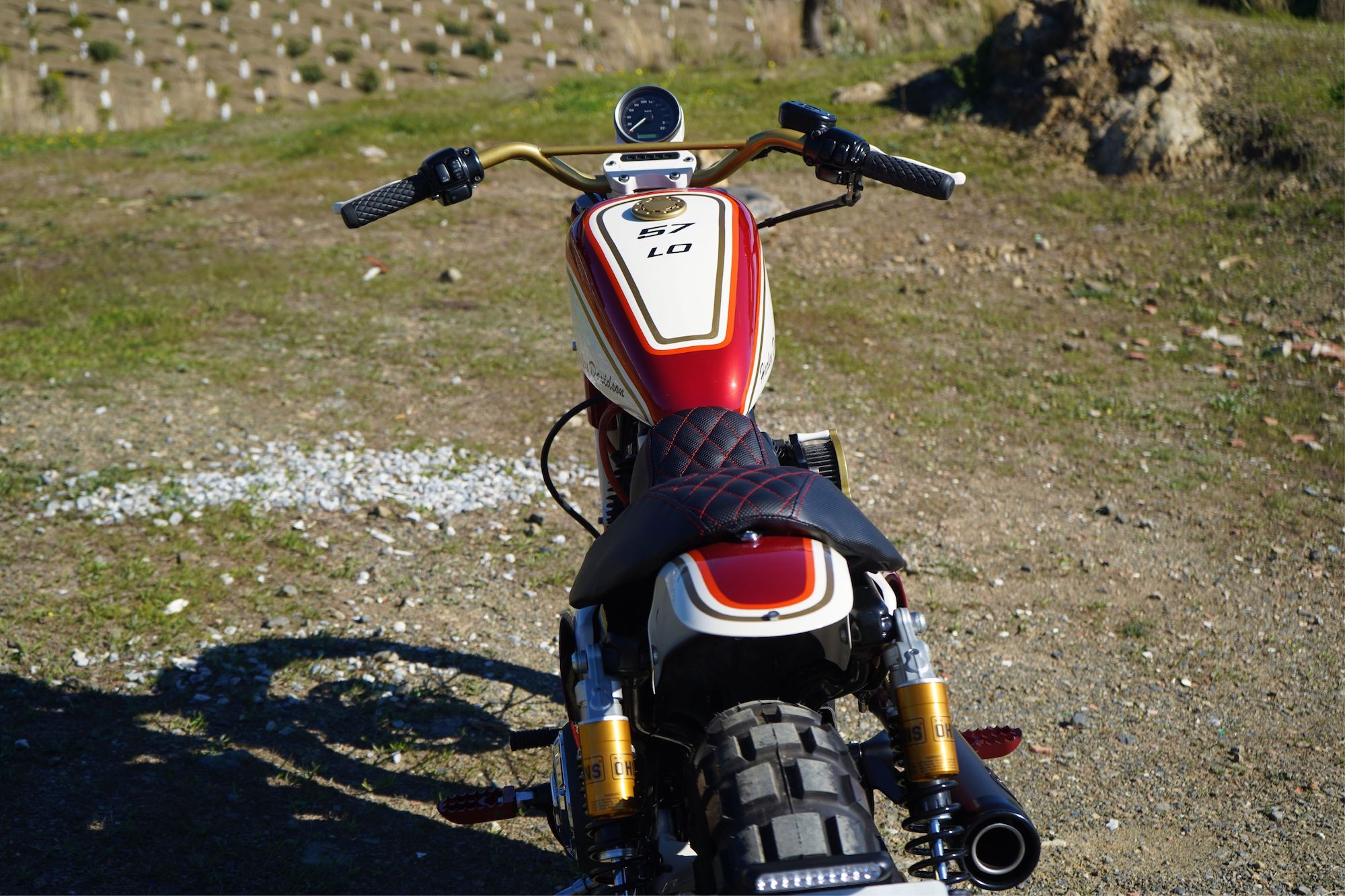 Front forks have been tweaked by hand, joining the handmade sump cover, side number holder, and a neat saddle (a black perforated leatherette with red thread chosen for the latter perk).