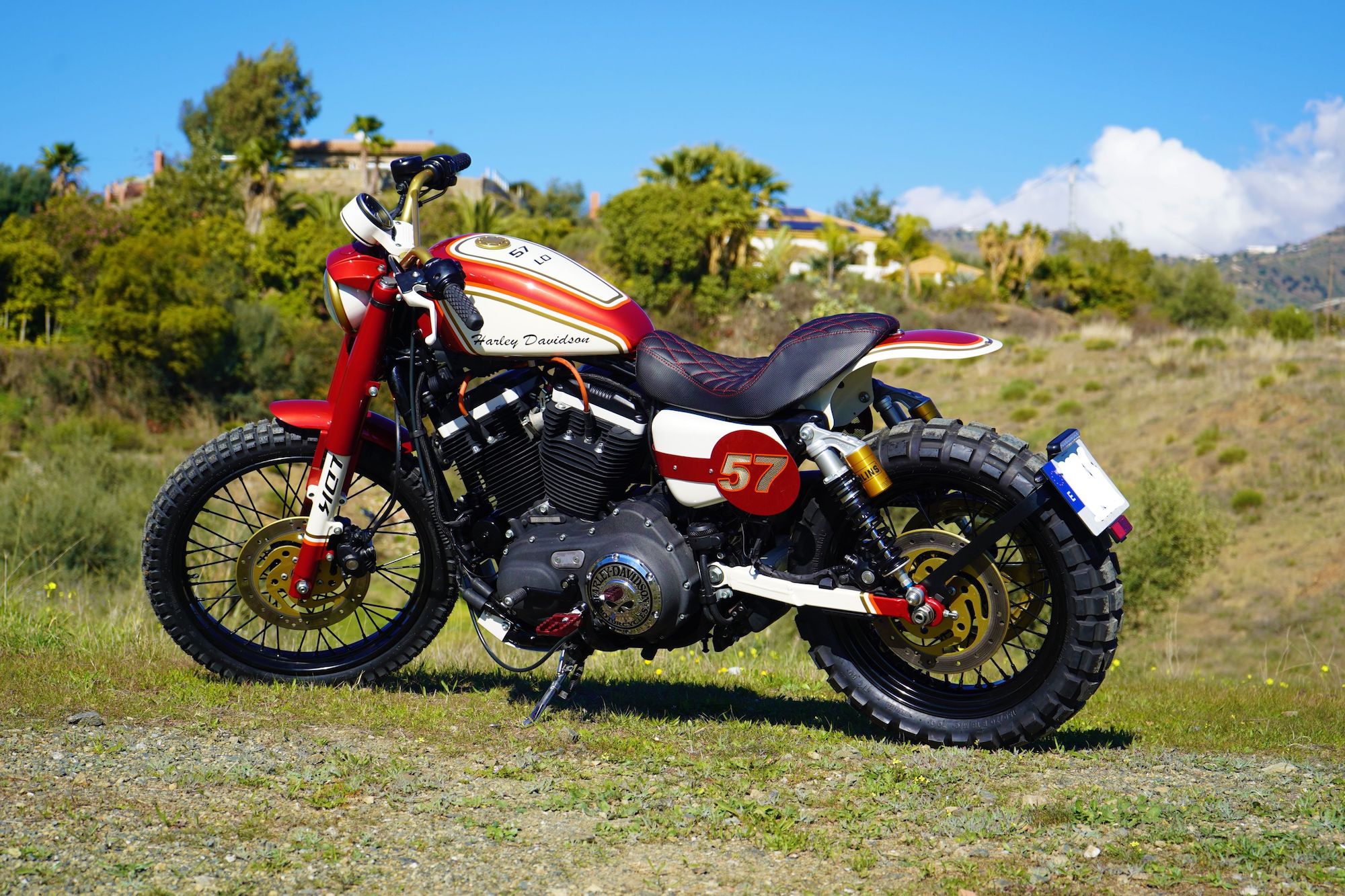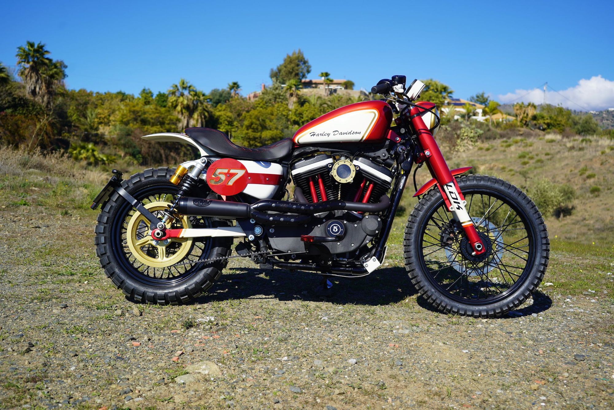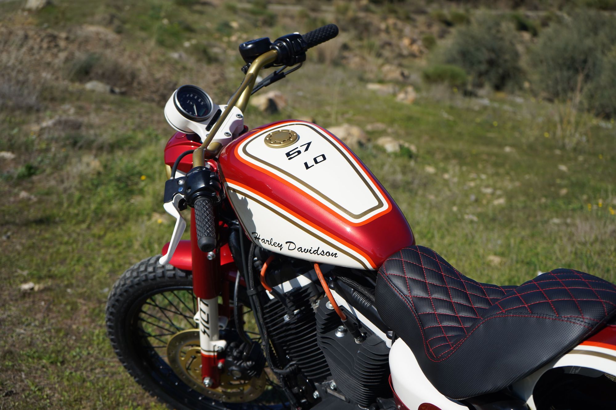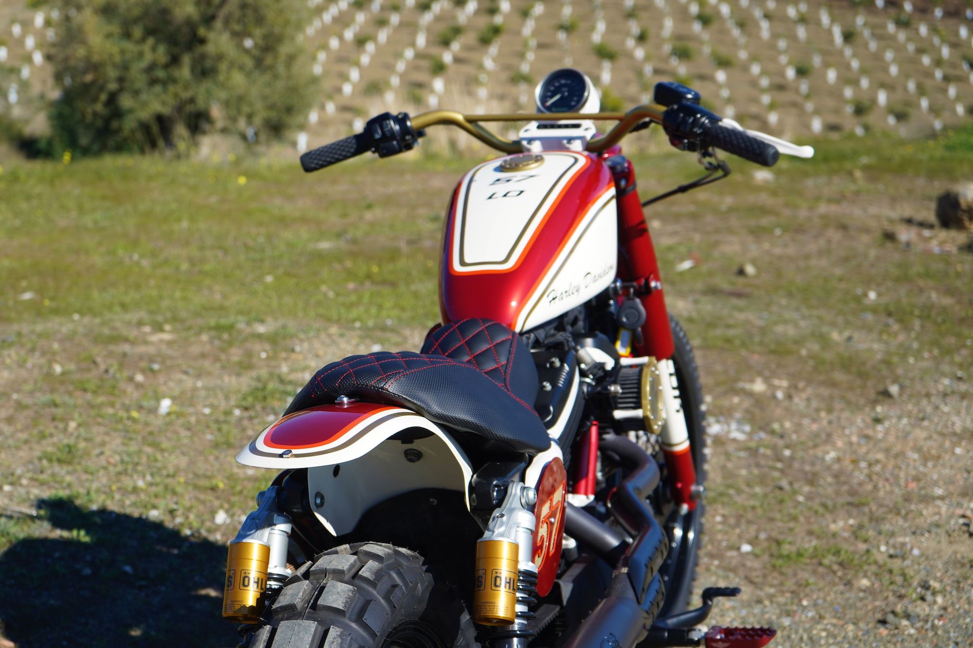 Complete the build with a 2:1 RSD exhaust, custom Sportster air filter, BMX style foot pegs (the kind made for Harley), and LED turn signals, and you’ve not only got a functional bike with quality components – you’ve got a candy red piece of sexy with cream white and knobblies for days.