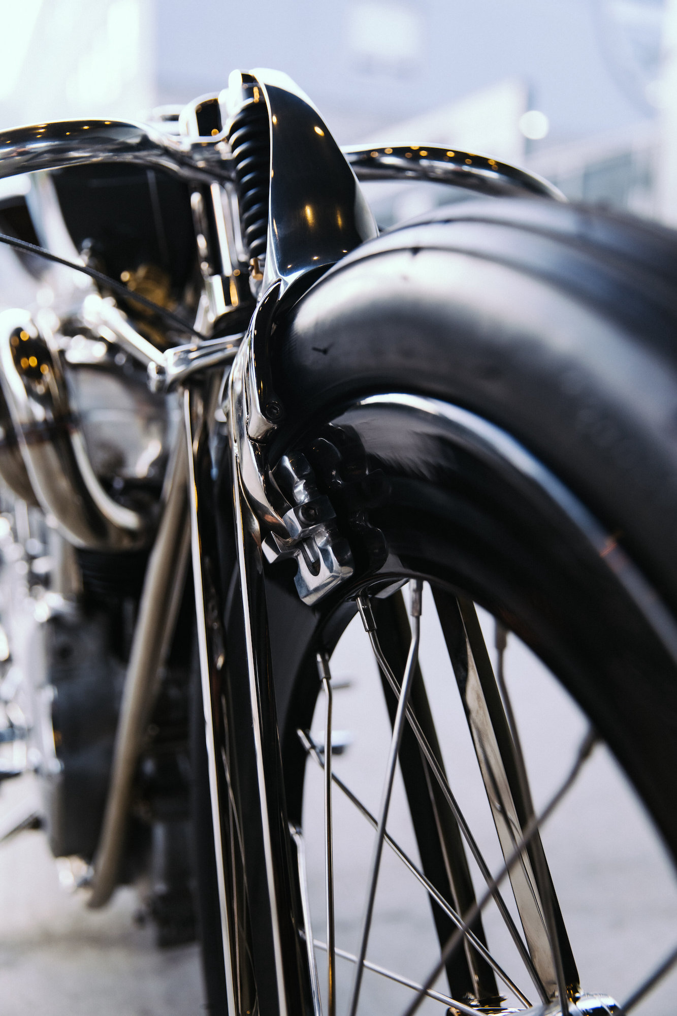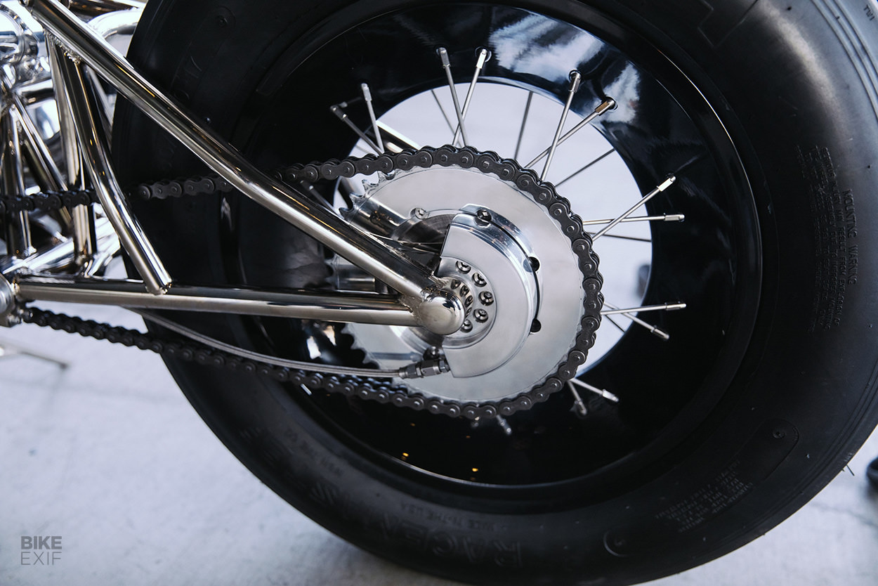 The unit dresses a fantastically engineered, deep-V, ‘bicycle’-style set of tyres, which started out as two aluminum halves ‘held together with stainless steel dowels secured by the spokes’ tension.’