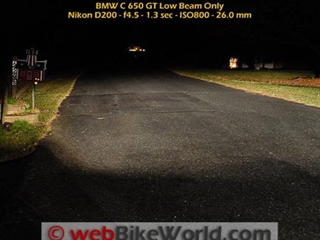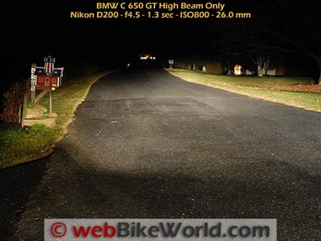 The light mounting brackets weren’t tightened yet, so I aimed the wider beam to illuminate in front of the scooter and augment the scooter’s low beam headlight, which is a single bulb on (curiously) the right-hand side of the dual headlight array on the BMW scooter.