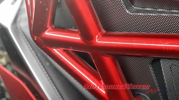 This presents the typical trellis frame fixed no longer to the engine but to the battery which, placed inside a carbon cover, becomes structural.