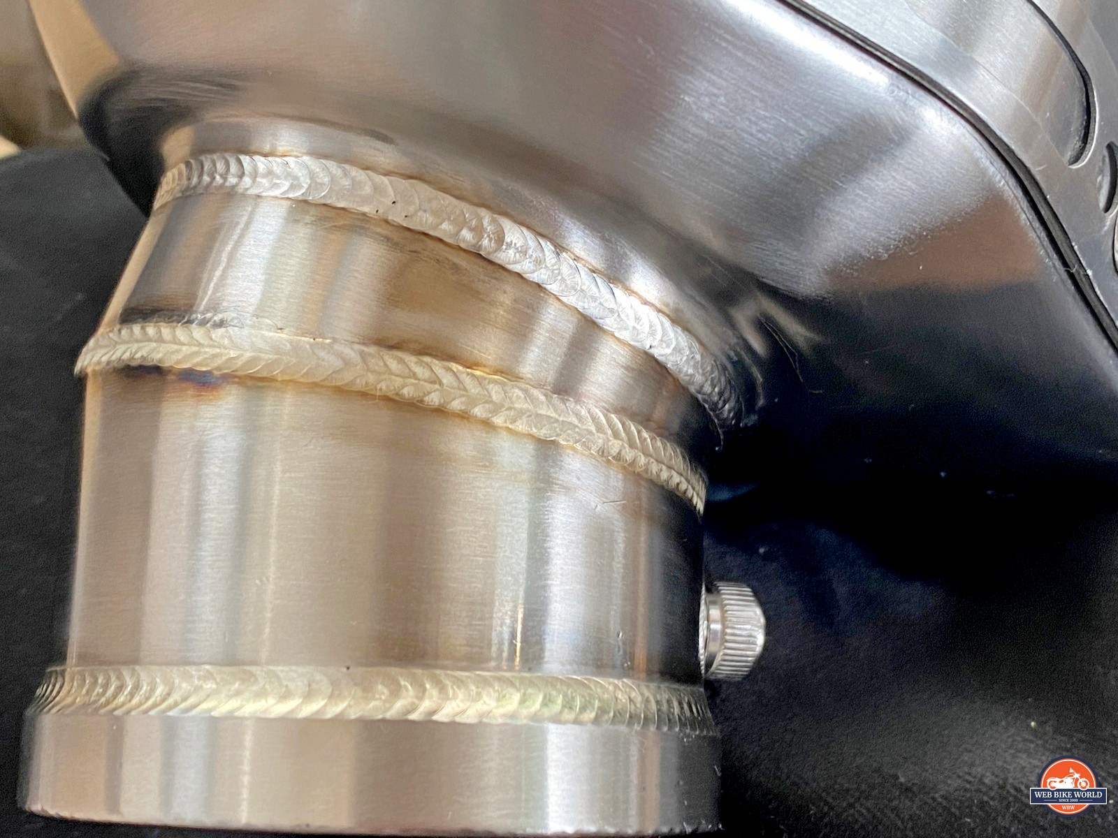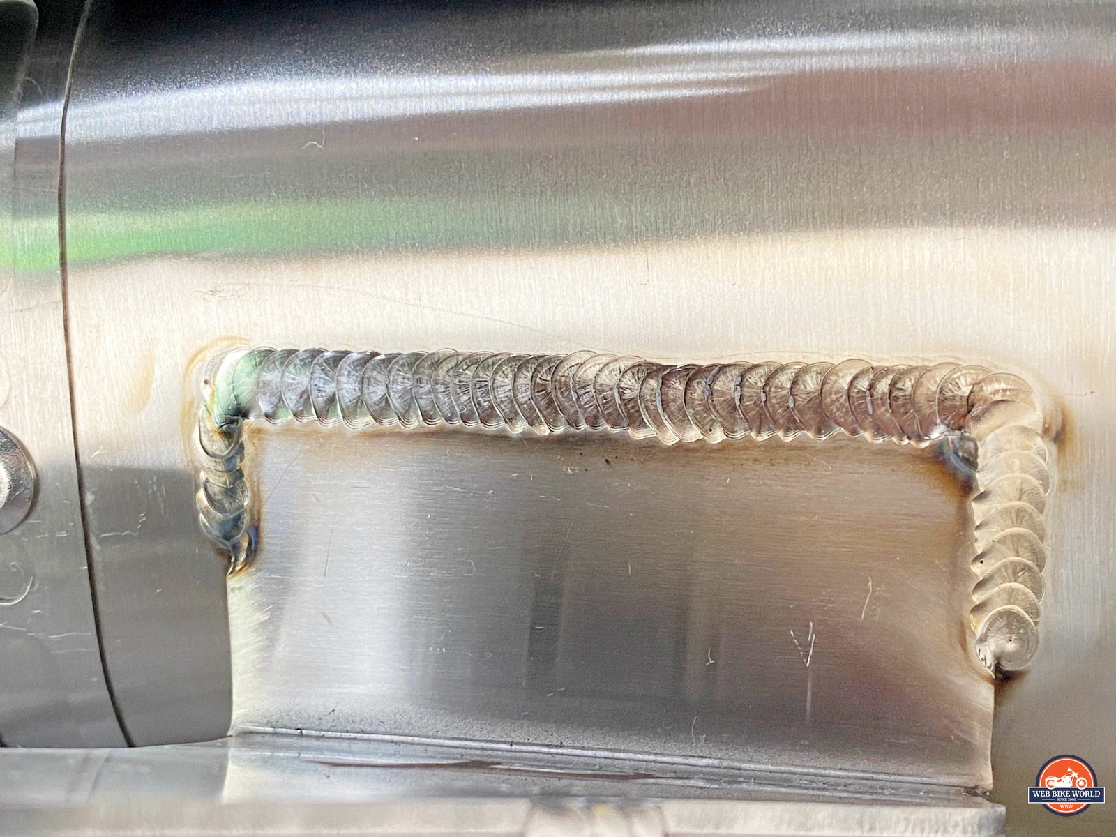 You’ll also note these near-perfect overlapping TIG welds on the end cap to give this muffler a Dakar-inspired appearance. I can’t stress enough how much skill is involved with doing this kind of welding.