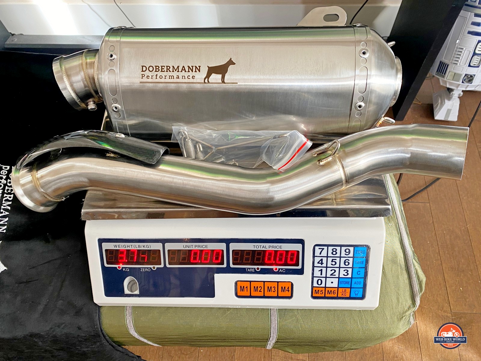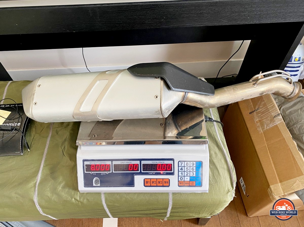 Interestingly, the stock muffler and pipe with over 5000 miles of run time came in a hair lighter at 3.63 kg or 8.02 lbs.