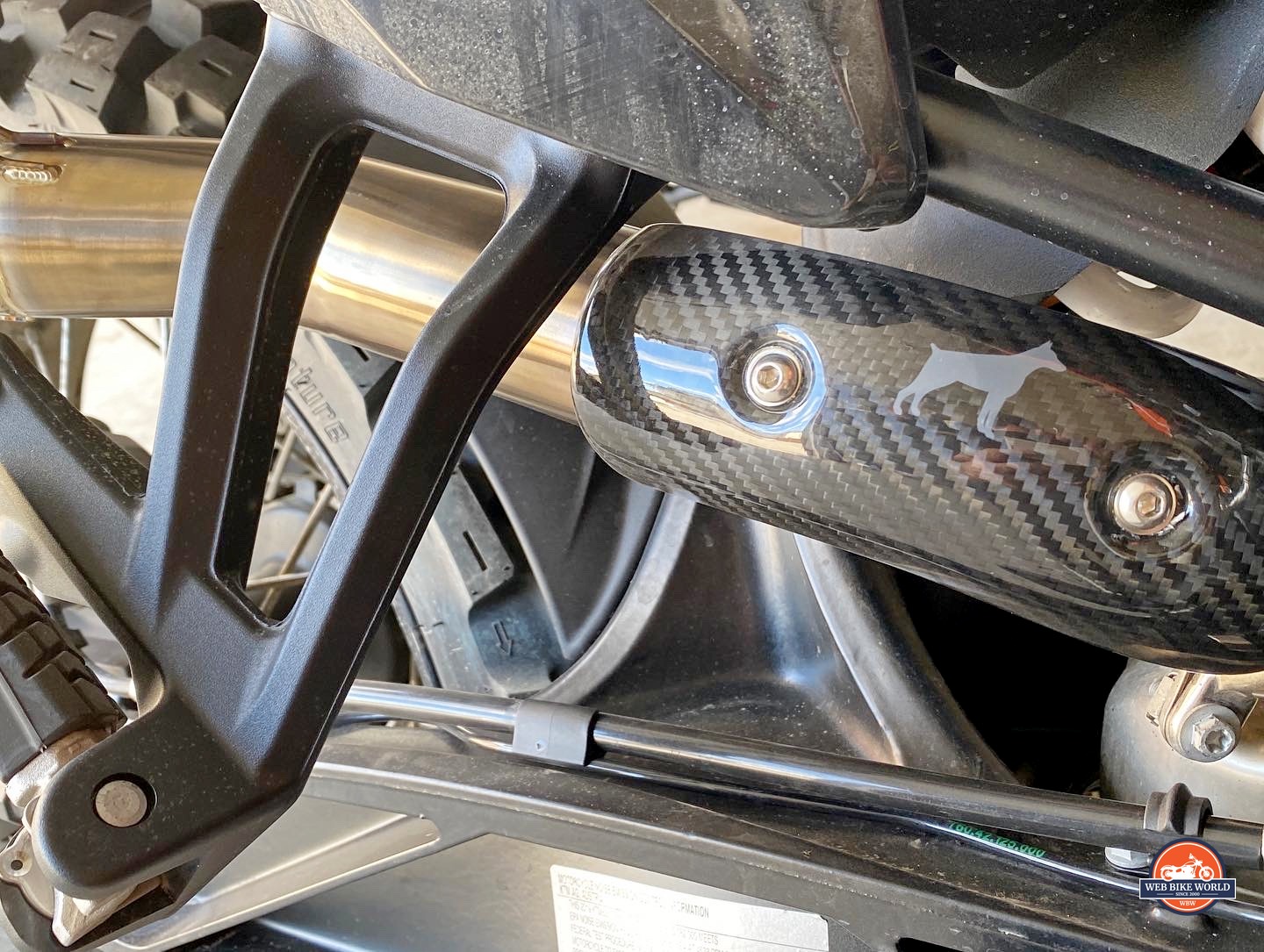 There’s a slick-looking piece of carbon fiber on the pipe that links the muffler to the catalytic converter with the Dobermann logo on it. That’s so much nicer than the aluminum one on the stock KTM pipe.