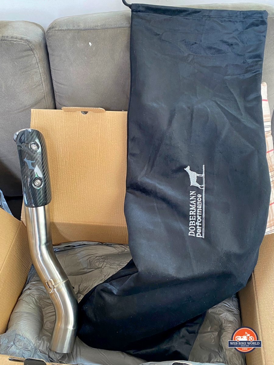 It’s clear Jens and company know their target audience. The muffler and pipe arrived in perfect condition and wrapped in a black velvet bag.