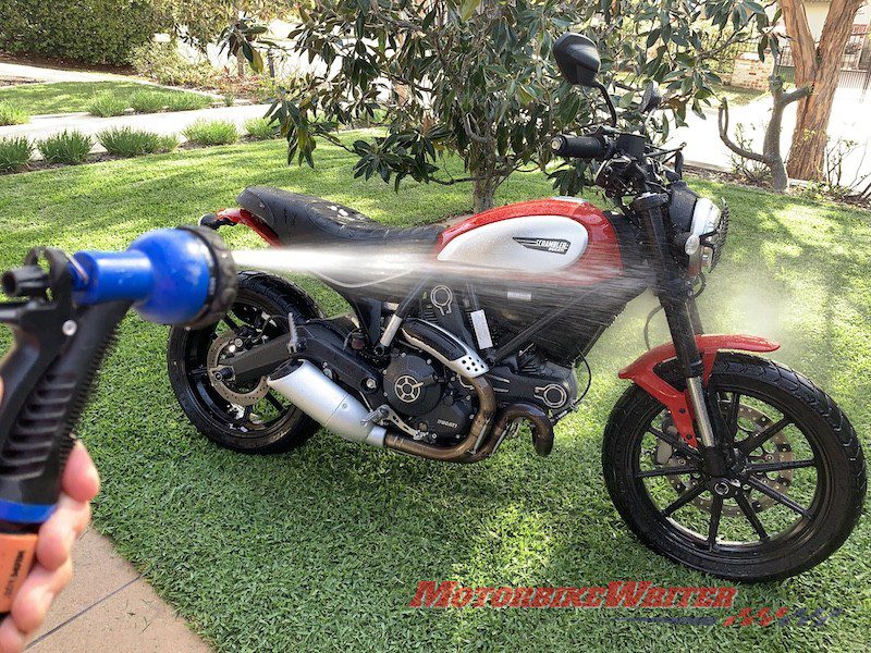 If your motorcycle is covered in mud and grit, you shouldn’t attack it with anything that might scratch paintwork.