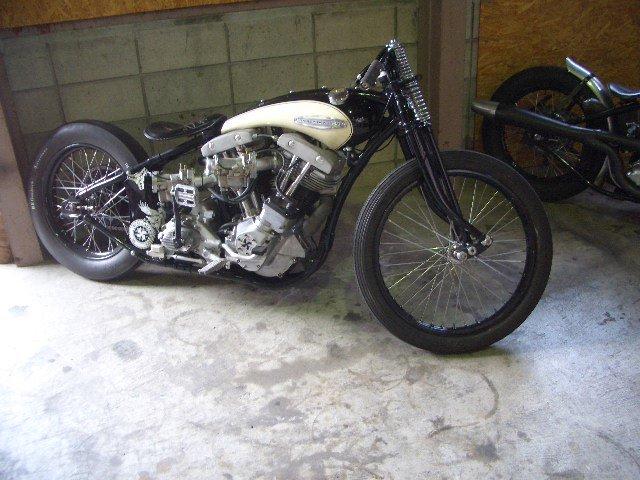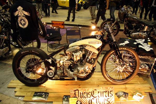 By Lock Baker: I saw this bike a few years ago and found it interesting. I love dual carbs. There are so many different ways to make 2 carbs fit on a Harley Davidson. There is the standard “plenum” manifold, like what Indian Larry did, and I did on “Speed Fetus” and “Scott’s bike”. There is also a ton of different ways to do 1 carb per head. You can make independent manifolds that pass by each other on a normal head configuration. Check the Mad Jap- his knuckle has that setup. Or you can modify your heads with new intake ports aiming wherever you like. Or you can do two front heads, or two rear heads, probably the hardest way because it requires cam/lifter block/cylinder stud/ modifications. Finally you can do it this Duas Caras way, by just switching duties of the ports on one of the heads, in this case the rear. In other words, just make the exhaust the intake and vice versa. -Lock Baker, Eastern Fabrication