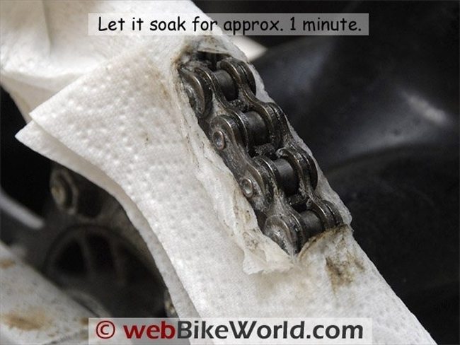 So after I brushed the entire chain by slowly rotating the rear tire, I wiped it down with a couple of folded paper towels and then soaked it again and repeated the process.