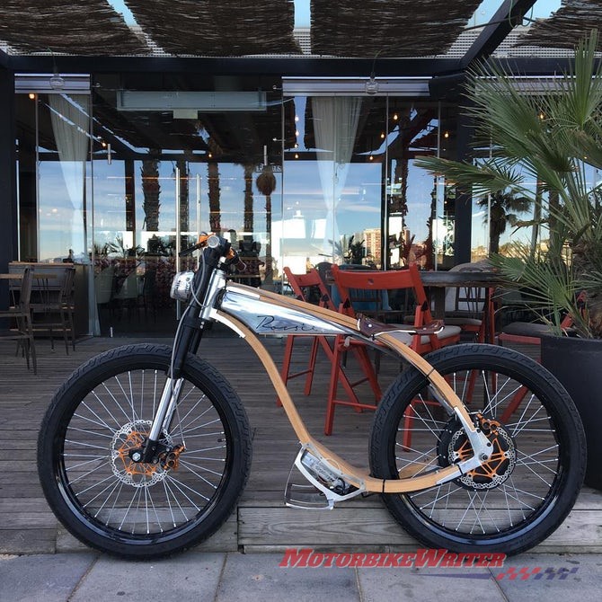 Rocsie visual content manager Xavi Coll says their e-motorbike is made “entirely out of wood, metal and leather”.