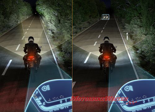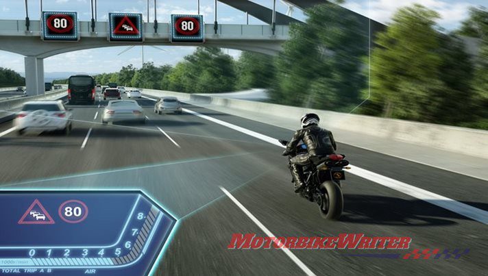 They are also working on sensors that detect roadside speed signs and display them to the rider, adaptive cruise control, blind spot detection and automatic switching to high beam.