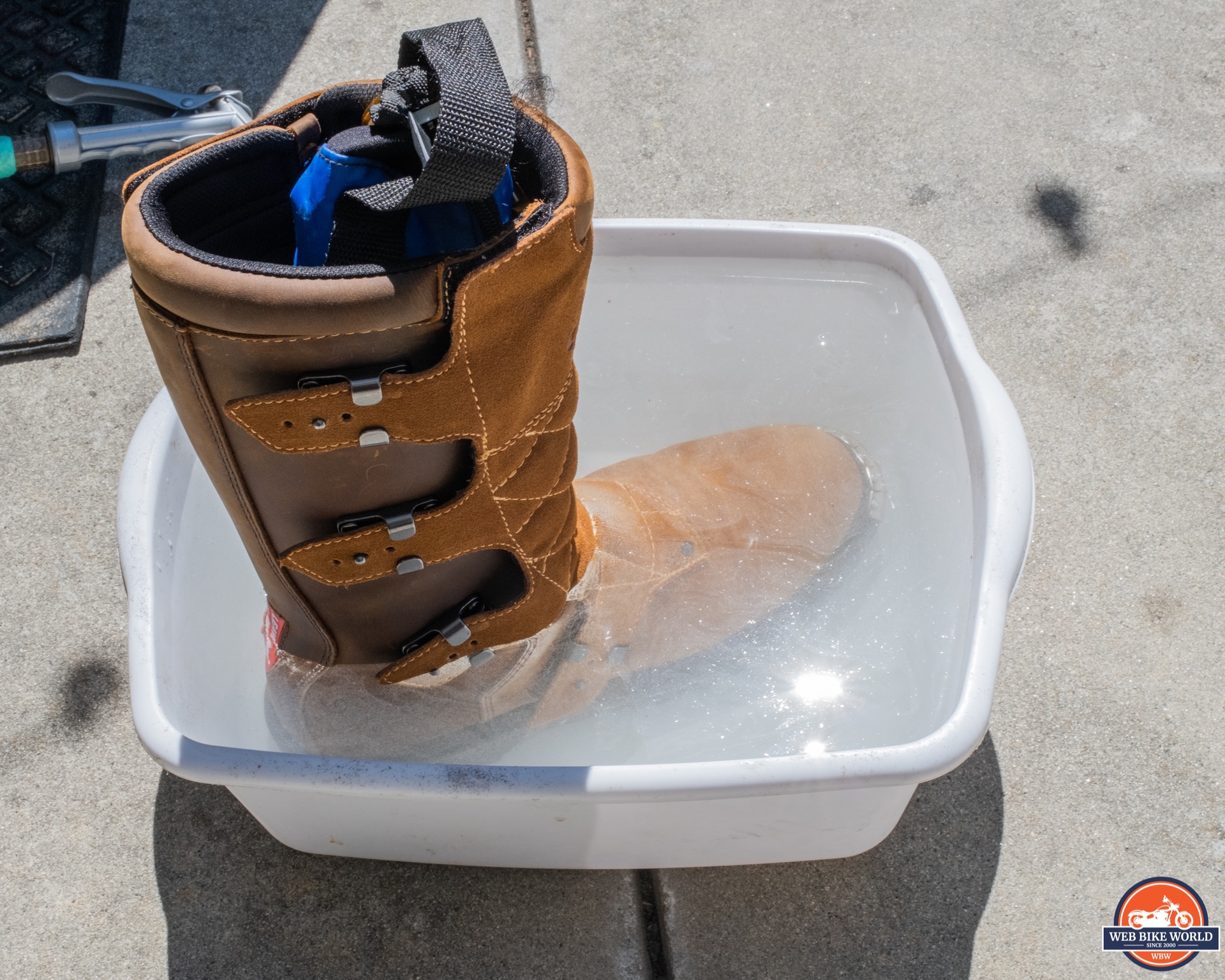 I have found that when I test for water using a single Kleenex tissue, it reveals water intrusion more accurately than just feeling by hand or foot. I placed the tissue on the footbed. The blue thing in the following photos is the little sandbag I used to weigh down the boot to keep it submerged in the bucket.