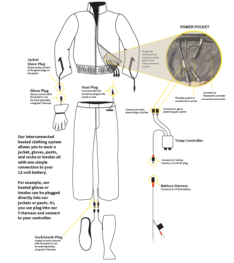 The Y harness is the more economical way to connect the temperature controller to the two gloves while the heated jacket liner is the expensive way to warm your entire upper body thanks to heating elements embedded in the chest, back, neck, and elbow areas.
