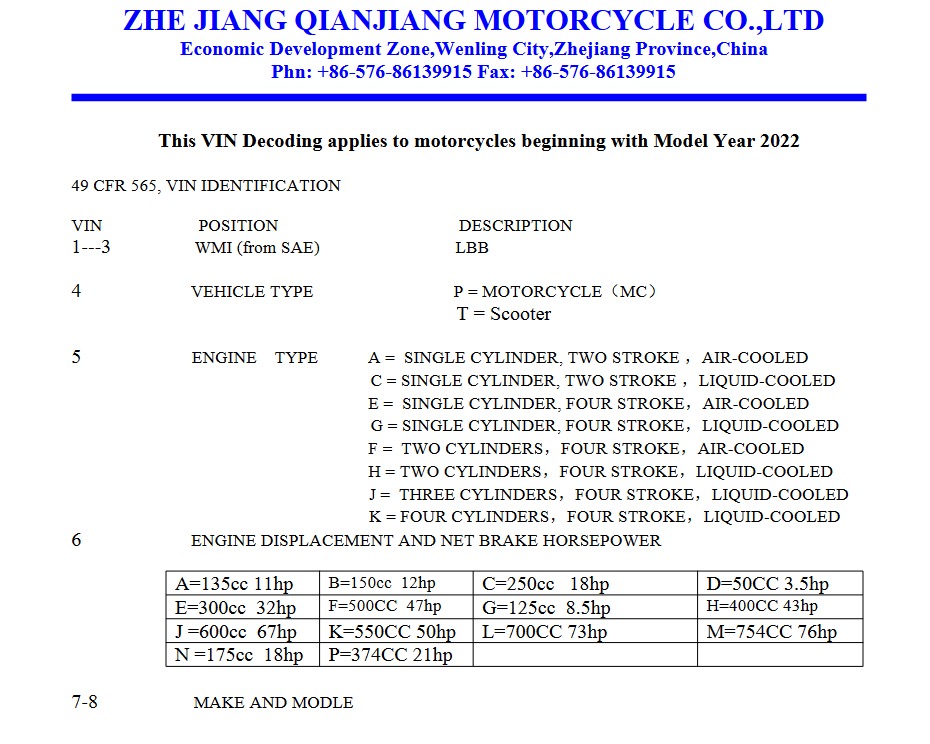 “In this set of codes, the first three characters are again ‘LBB’ for Qianjiang. The fourth character is ‘4’, representing middleweight models displacing 351cc to 900cc. Characters five and six denote the model designation, in this case, model codes LWZX350 and LWZX350RA.”