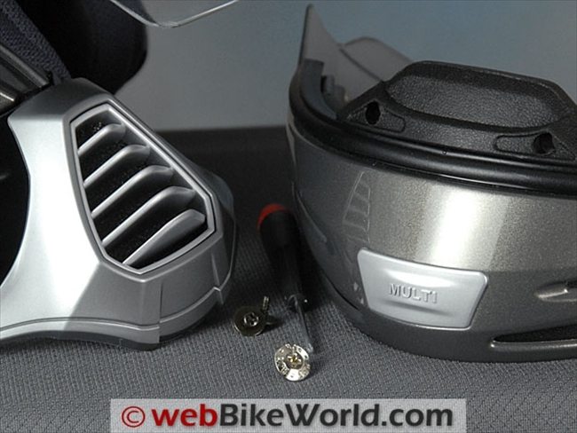 The chin bar comes with a small plastic insert with the word “Multi” molded in, as can be seen in the photos. This part is held by a single self-threading screw and a washer that fits in a recess in the padded chin bar.