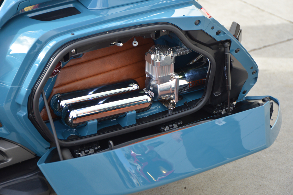 The bike gets air suspension, batique-style mufflers, a custom hand-crafted leather seat, and a light blue paint job among other things. The air compressor for the suspension system is hidden away in one of the saddlebags. As far as technology goes, the team didn’t skimp out. The bike gets the first-ever motorcycle blind-spot monitoring system among the Gold Wing’s other current tech. Steady Garage Co-founder Kevin Dunn sounded proud of the finished product.