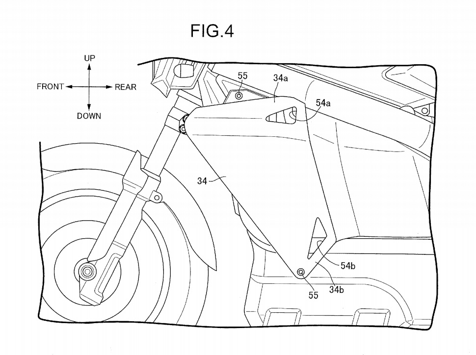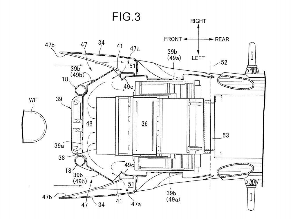 The patent focuses on the air intake for a hydrogen fuel cell motorcycle. The intake moves air over the fuel cell to cool it. There is a small fan designed to expel air out behind the motorcycle, too. Power from the fuel cell, which sits more or less under the seat, will go to the rear wheel through what looks to me like a shaft drive.