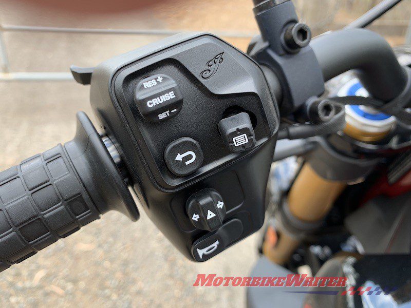 The 19/18-inch tyre combo is strange and the flat-track tread pattern is handsome if a bit noisy on the highway and slightly vague when leaned over on the sharp edge.