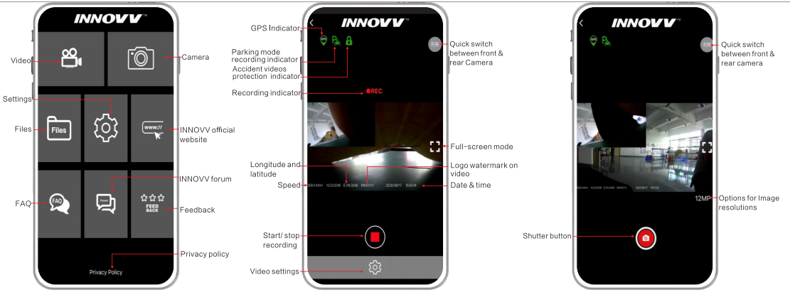 As shown in the screen snippet above taken from the INNOVV K3 Manual, the main screen of the INNOVV App has eight tiles identifying the functional groupings: Video, Camera, Files, Settings along with (if connected) links for the INNOVV website, FAQ, INNOVV forum, and Feedback.