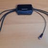 The output side harness is a sturdy shielded cable terminated with a 3-pin (F) waterproof connector that connects to its 3-pin (M) (colored) DVR lead counterpart.