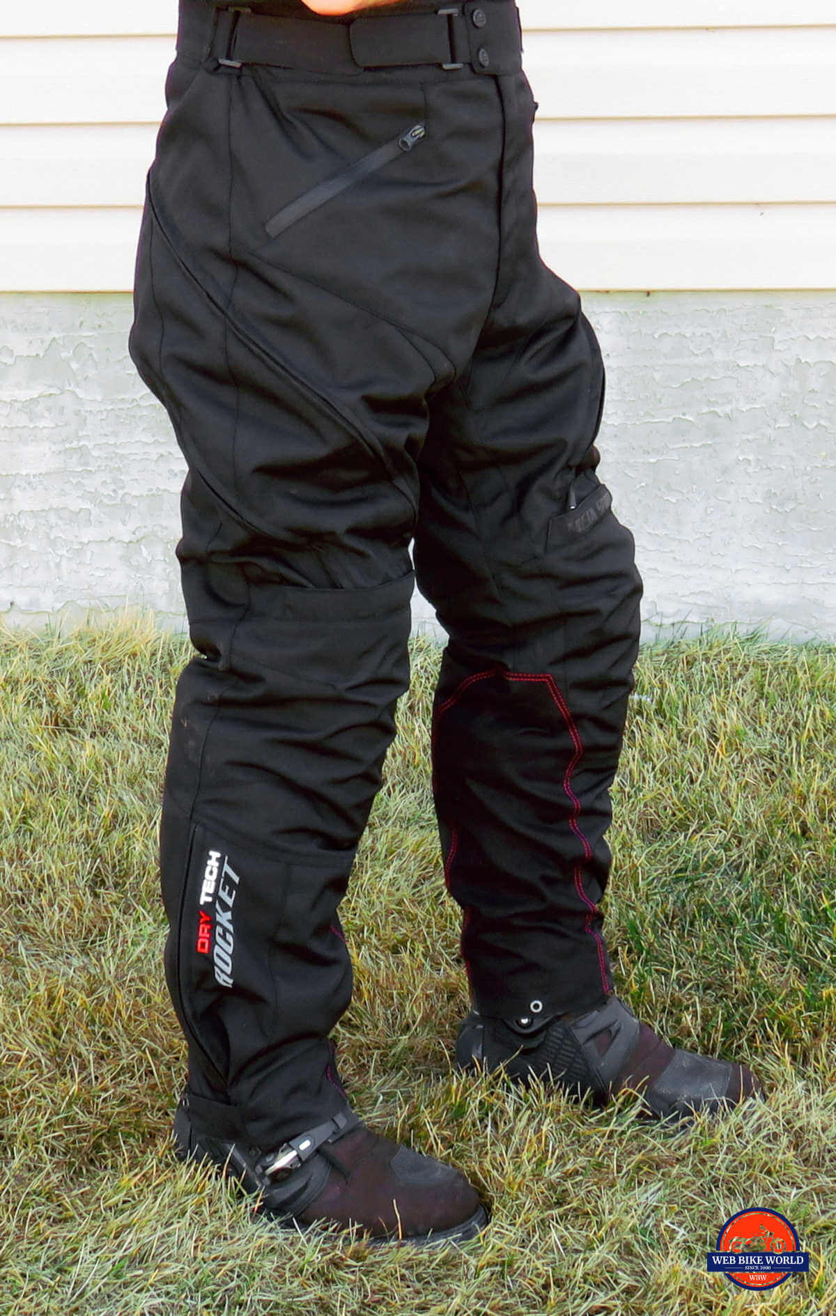 I really like the “Rocket” branding locations on the right, outer shin, and center of the waistline in the rear. These and the “Dry-Tech” lettering double as the reflective material on the pants, but I would have liked to see perhaps some reflective piping running the outside length of each leg just to help out a totally black colored piece of gear stand out on the road in bad weather.