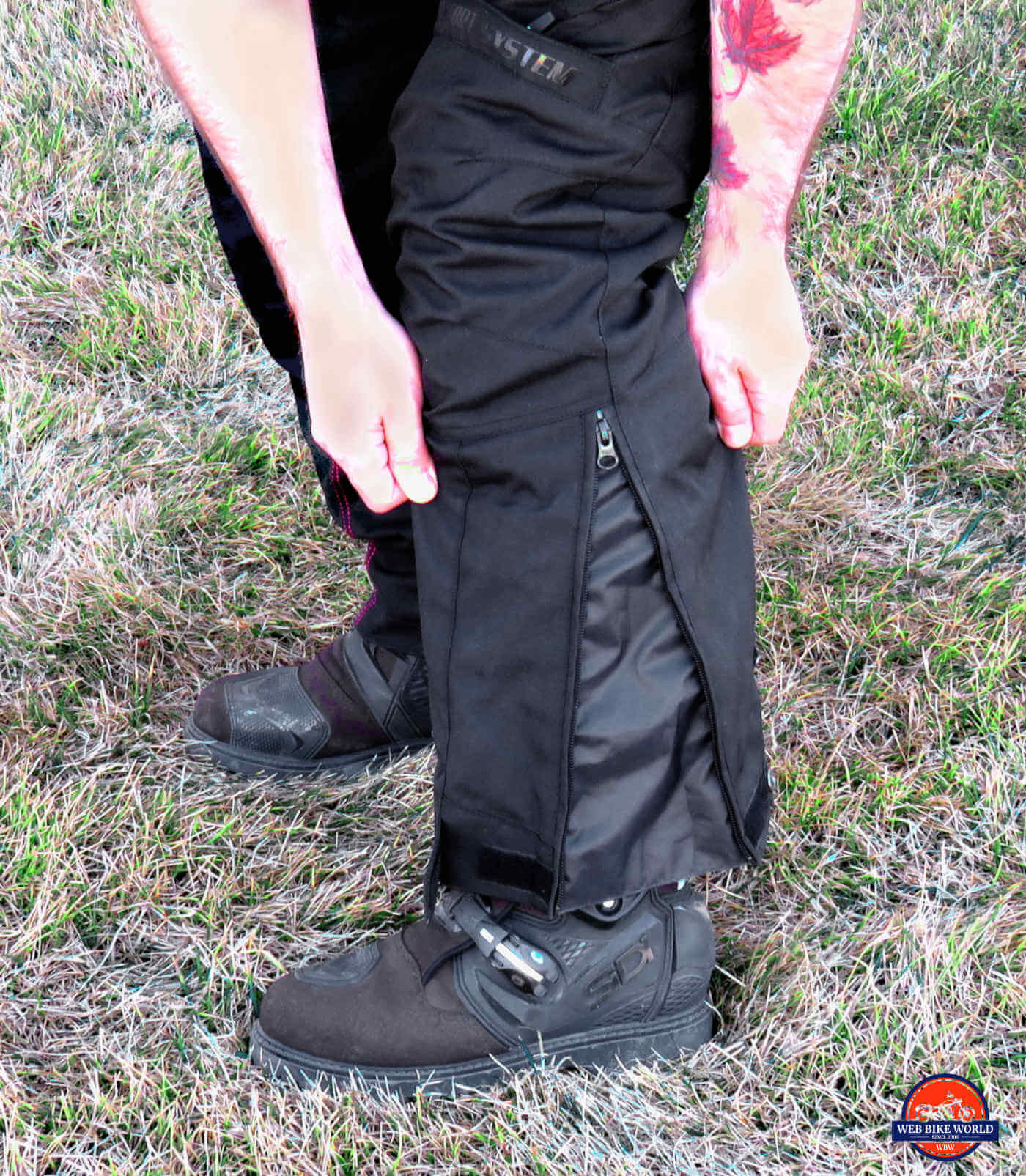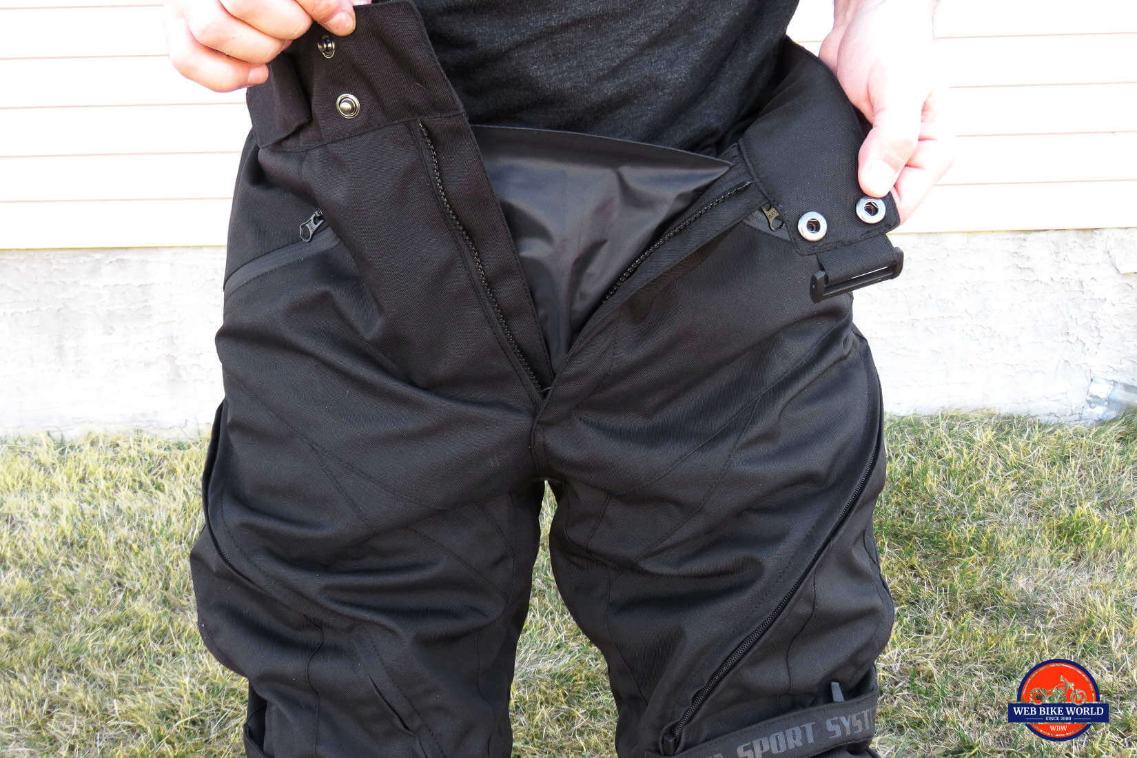 The length obviously was going to be 3” too long because even the short sized pants have a 30” inseam, and I accept that. The legs fit me just fine width wise and even the knee armor seems to line up pretty well with my tall Sidi Adventure 2 boots inside. The weirdness comes around the hips and waist area where even with the “Sure-Fit” velcro adjustment system at the smallest setting I have about a 1” of a gap around my waist.