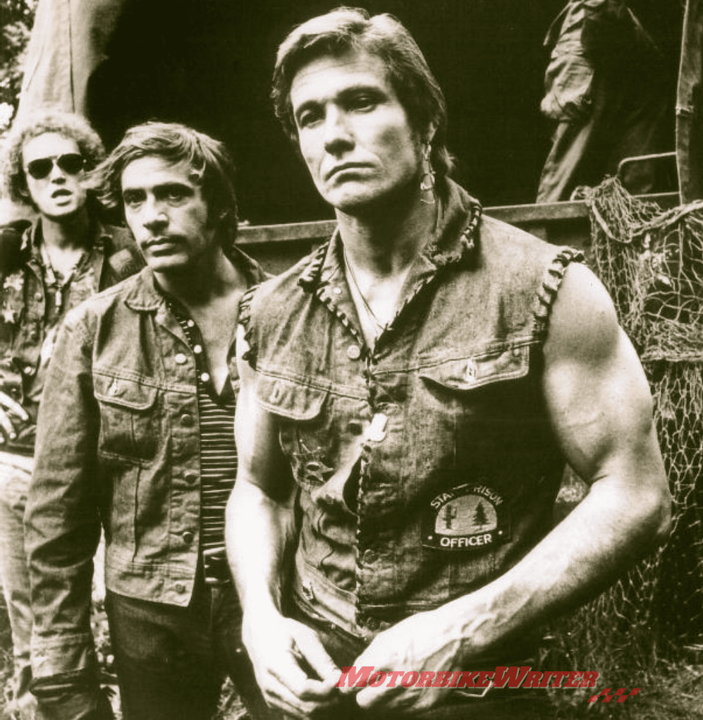 Bill was a physically exceptional man, and was known to do his own stunts. Whether it was a 15-foot jump on to Nick Nolte in the 1976 Rich Man, Poor Man ABC mini-series or actually brawling it out (and busting three ribs) with Rod Taylor in 1970’s Darker Than Amber, or being attacked by dogs in 1982’s Conan The Barbarian, on motorcycles it was no exception. In the film The Losers where Bill again played the leader of a biker gang that takes on the red army in Vietnam; he did all his own stunt riding for the exception of one jump over a building. Producers, like in The Great Escape with Steve McQueen (not being allowed to jump his bike over the barbed-wire fence), had Bill step aside for contractual reasons and let his buddy Gary (the “Whiz Kid”) McLarty perform the bold stunt. Otherwise, what you got was all Bill. Transferring from a speeding bike to tackle a fleeing person, or power-sliding his bike and flying off into a tuck-n’-roll while shooting the enemy with his machine gun, Bill did it all in that film. With a production schedule of approximately 4-6 weeks and a budget of around $275,000, The Losers eventually went on to gross over $15 million, and Bill doing his own stunt riding only helped to legitimise the film’s preposterous storyline.