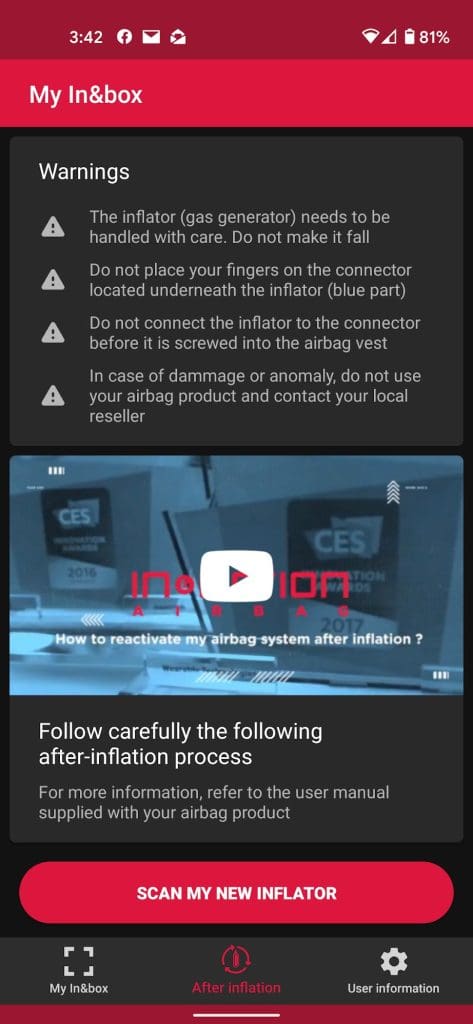 In&Motion has simplified the setup through the use of QR codes and Barcodes which the app can read which reduces the typing required to perform the setup. There is a QR type code on the label for the In&box and the vest itself has a serial number with an accompanying barcode. The latter is located inside the left side internal opening so if you don’t see the label have a look inside to find it tucked in this space. You’ll also find a barcode on the gas cartridge.