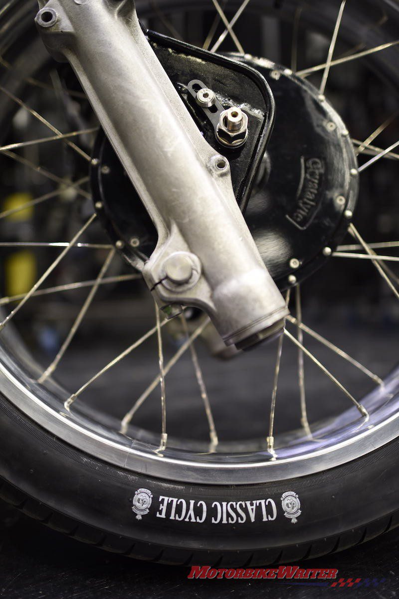 The bike looks almost identical to the 1976 model, even retaining the tainted badge, drum brakes and twin mufflers which would be pointless extra weight.