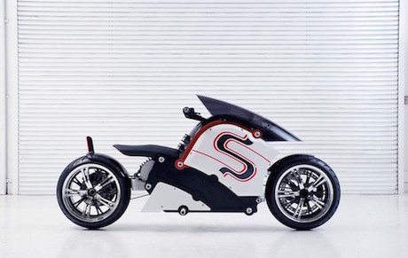 The designers claim it will have 160km range, a charging time of four hours and weighs a hefty 280kg despite much of the bike being made from sculpted aluminium alloy block.
