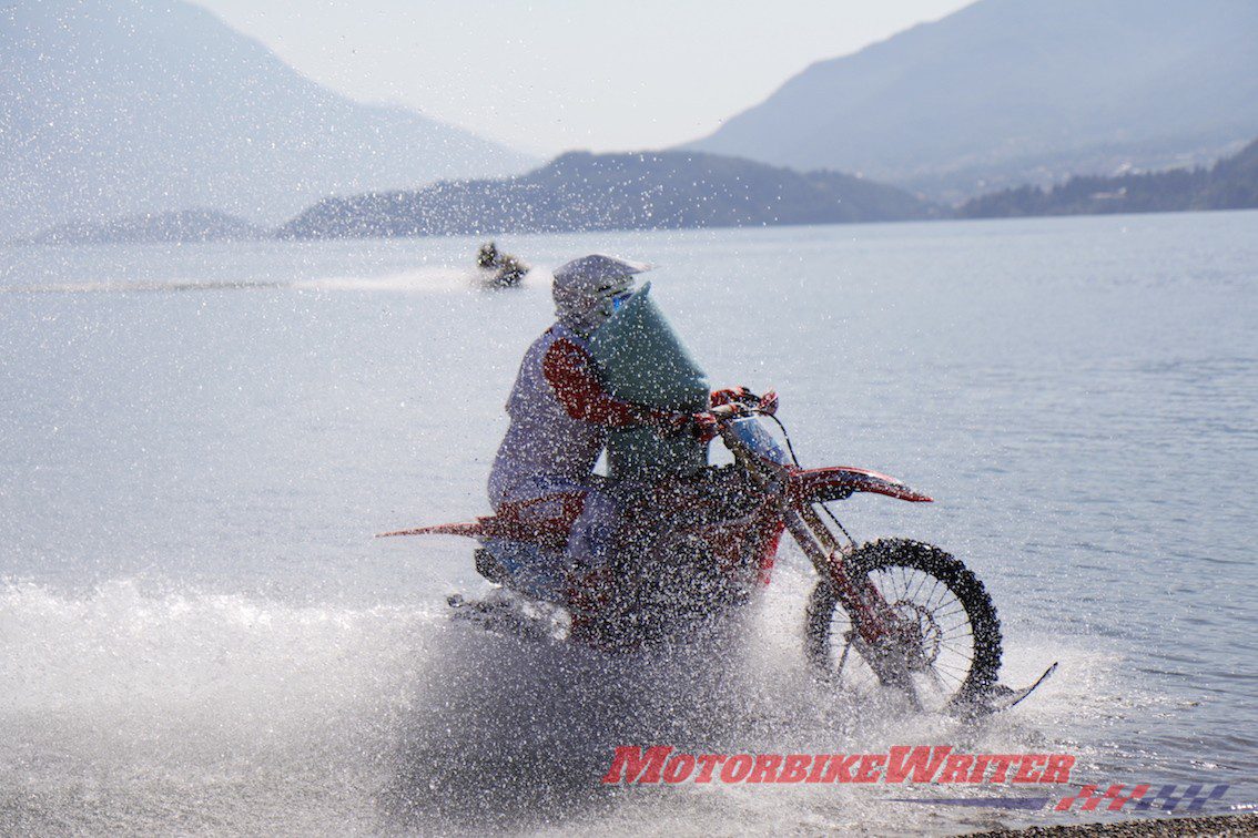 His bike was a Honda CRF 450R from Red Moto Desio-Milano equipped with nautical skis and a rear wheel paddle. The whole rig weighs 205kg.