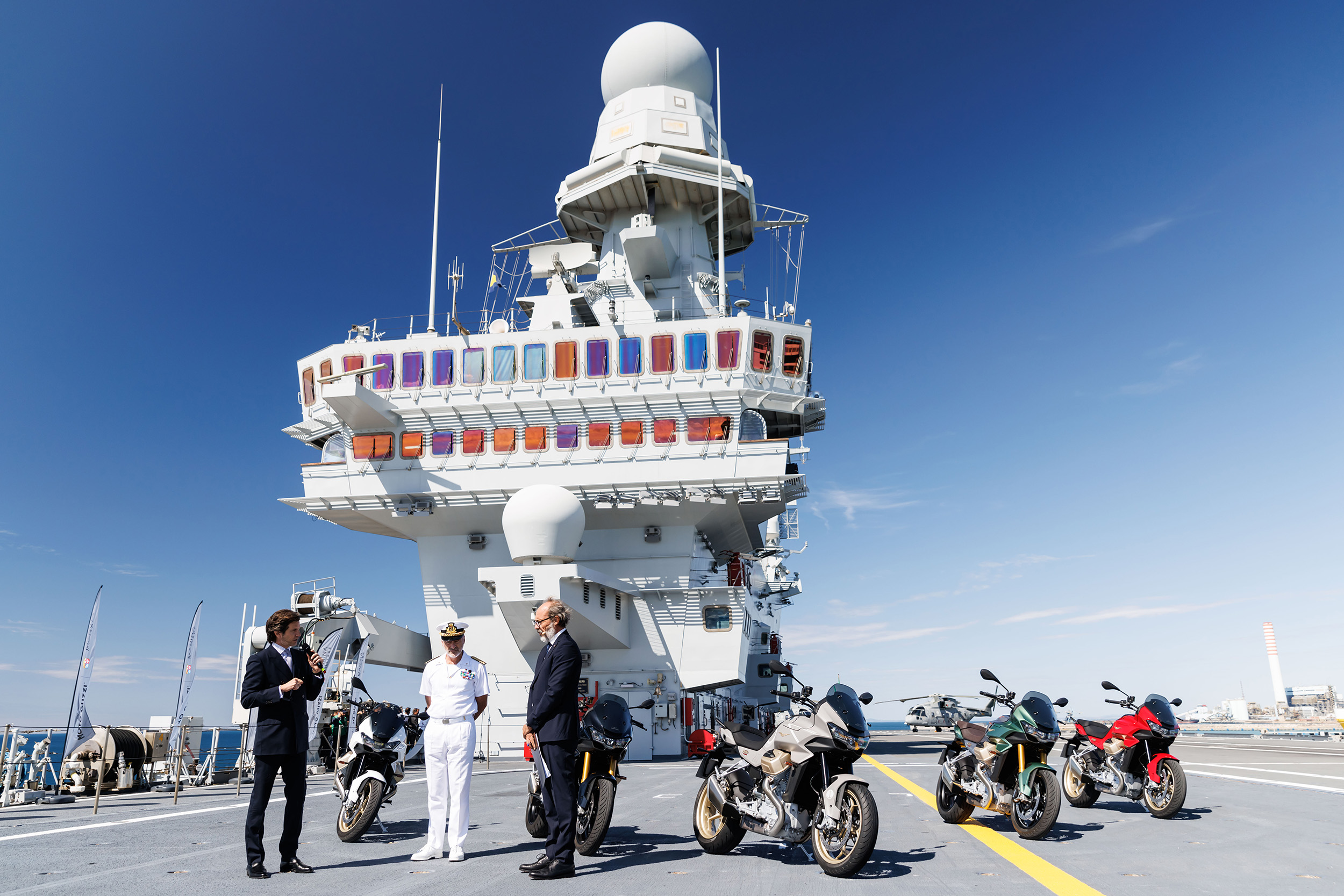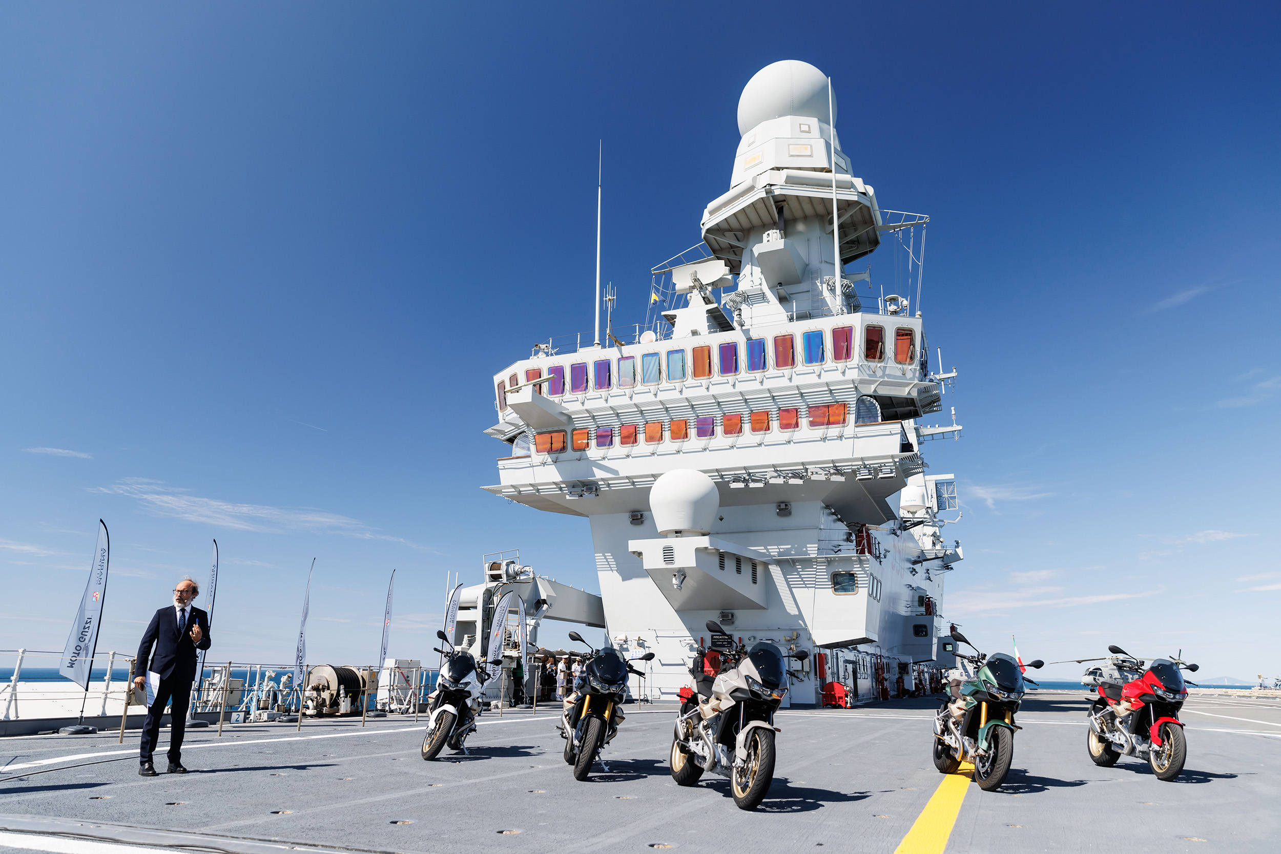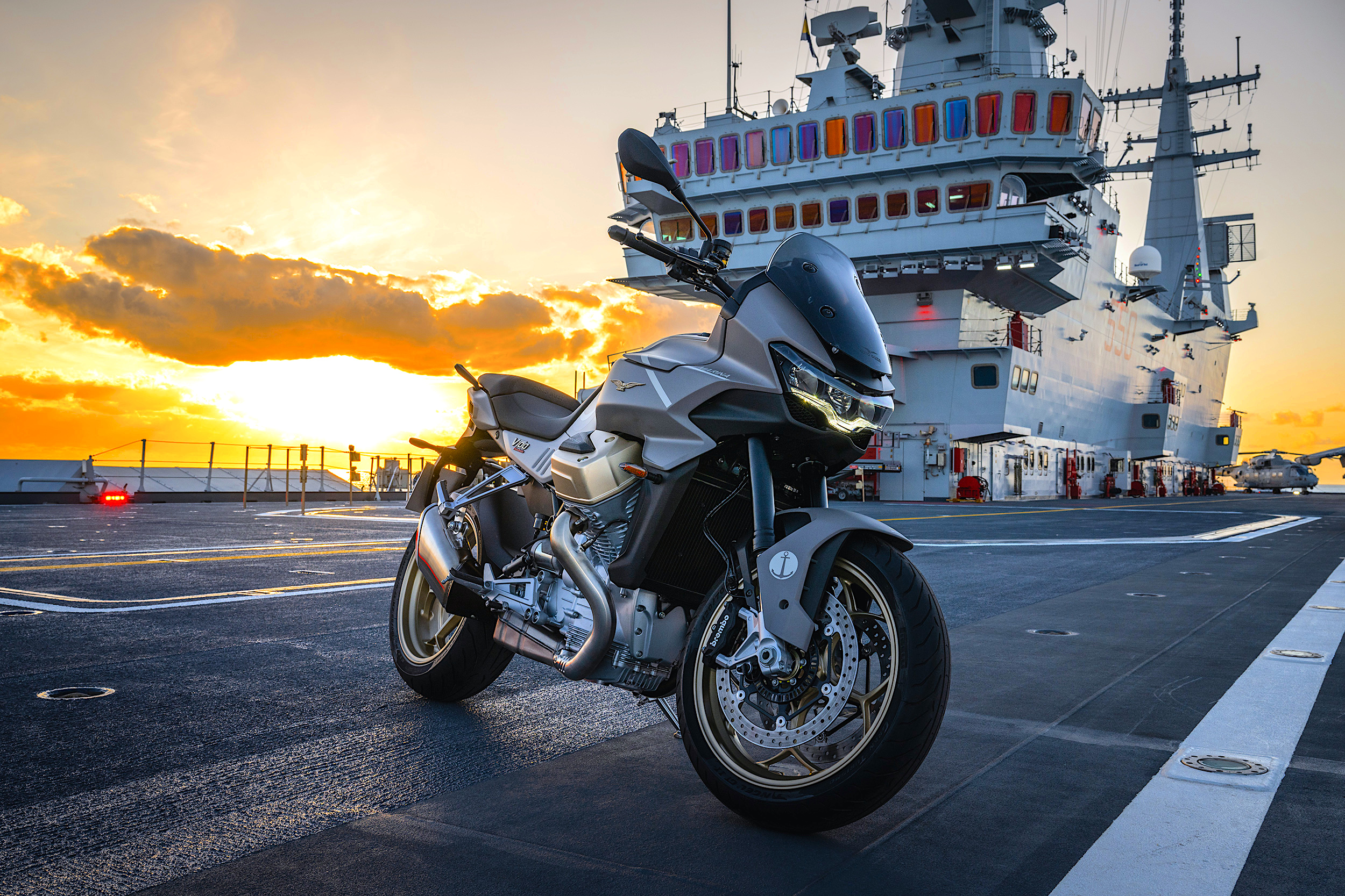 “On the spectacular stage of the flight deck of the Cavour aircraft carrier, Moto Guzzi and the Italian Navy…celebrated the close ties that have united them for more than one hundred years,” states a press release from Moto Guzzi.