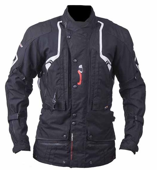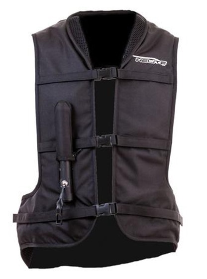 The airbag vest is worn over the top of any motorcycle jacket and inflates on impact to protect the upper body. The Helite textile and leather jackets include the airbag.