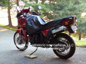 | Product Comments: Small waterproof motorcycle cover is easy to carry, fits in its own attached stuff sack. Includes four permanently attached bungee cords. | |