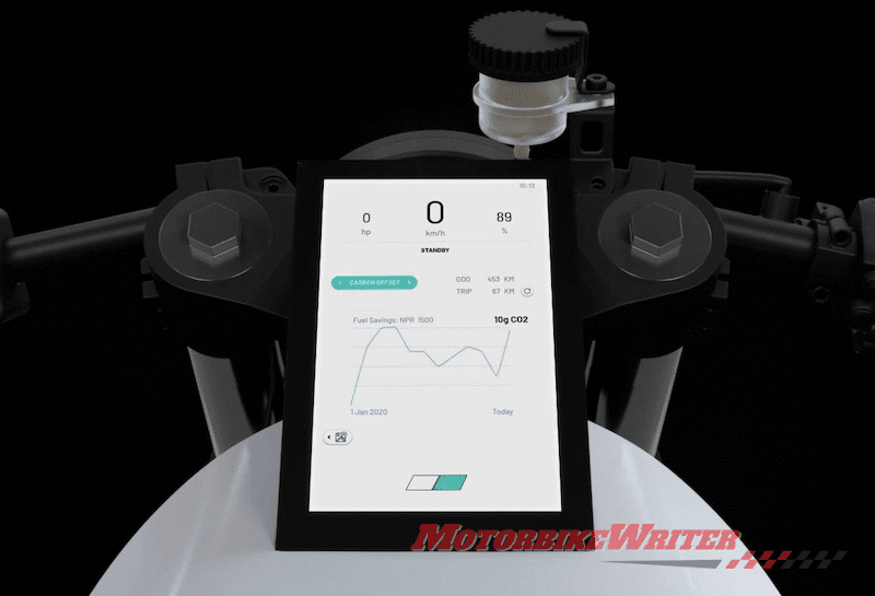A giant tablet-sized touchscreen on the first electric motorcycle from Nepal shows environmentally conscious riders how much fuel they are saving and their carbon offset.