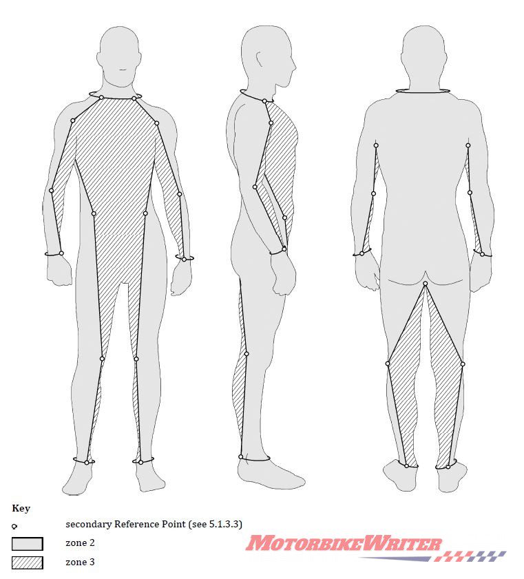 It is unclear why the standard has downgraded the higher risk to abrasion areas of the buttocks, sides of the leg and parts of the arm. This appears to be contrary to scientific consensus validated by research both in Australia and abroad that show these areas to be of a high risk. An example of this is the Class AAA garment requirements for abrasion. The very small zone 1 area must meet the 120km/h AART test speed whereas the bulk of the body that is identified as zone 2 must achieve 75km/h. This is similar with the Class AA garment where the Zone 1 area must meet 70km/h and the Zone 2 area 45km/h. Considering that a piece of denim can achieve 75km/h this means that the minimum abrasion protection levels of the bulk of the Class AAA garment is relatively low and the Class AA even lower.