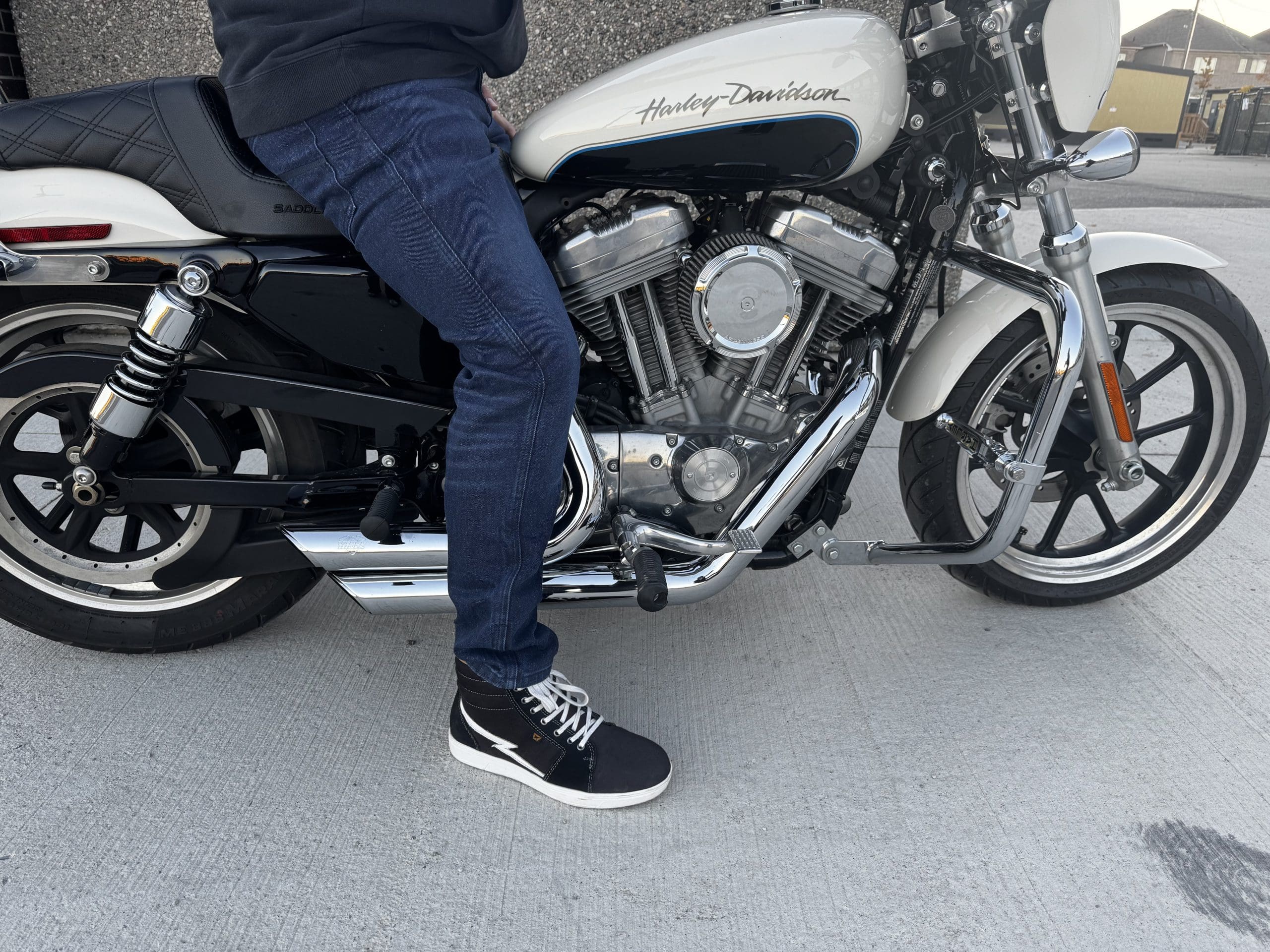 After reviewing Pando Moto’s Desert Cargos and being blown away by the mix of comfort, quality, and low-key style, I knew I had to grab one more piece before the Canadian riding season wrapped up. That’s where the Arnie Slim Blue jeans came in. I’ve always been drawn to casual, clean-looking gear that doesn’t scream “motorcycle pants,” but still packs serious protection underneath. These jeans promised exactly that: streetwear looks with road-ready safety.