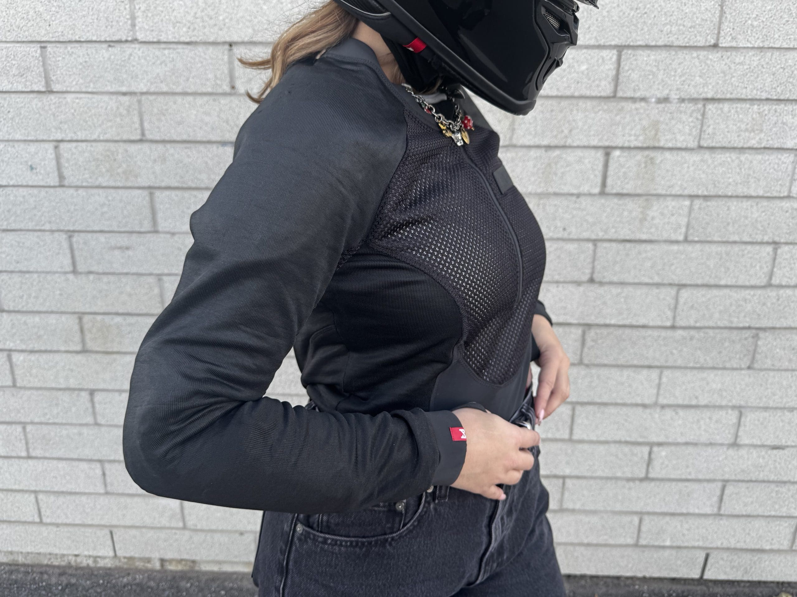 It offers that “second-skin” feel without being constricting, which makes a big difference on longer rides. The mesh panels help with ventilation, keeping it from feeling stuffy under a jacket, even in warmer weather. I’ve worn it under both textile and leather layers, and it never overheats or traps sweat the way some synthetic base layers do.