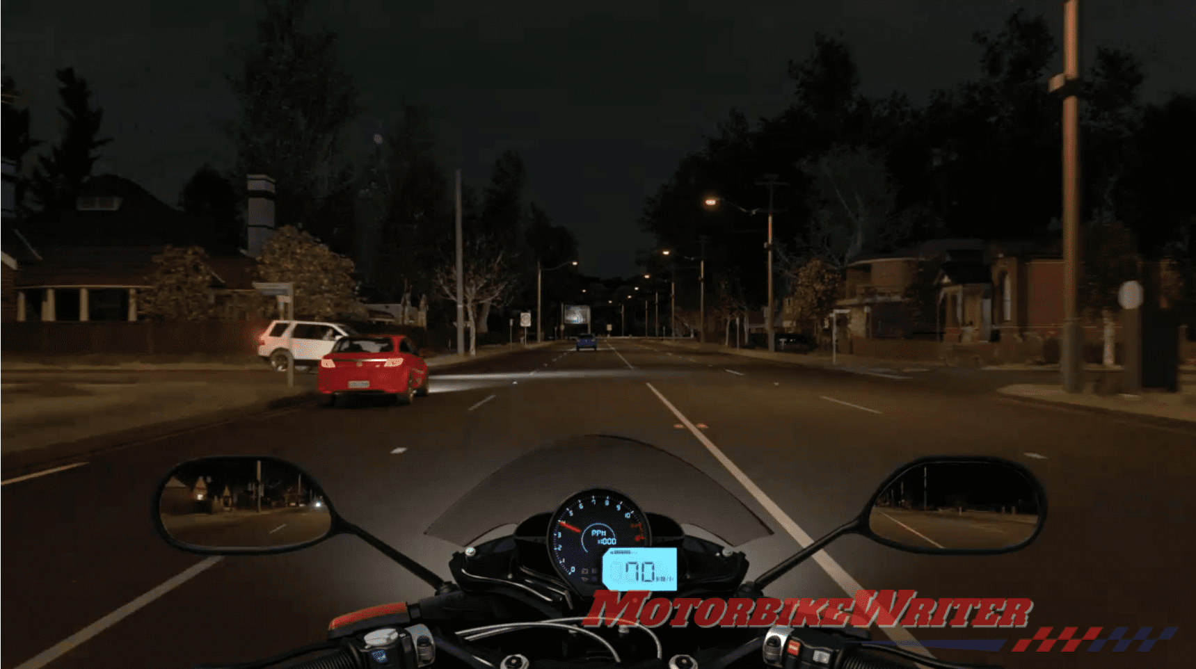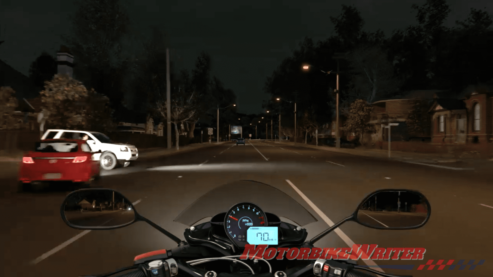 - Riding down a suburban street at night with a vehicle coming from a side street on the left;