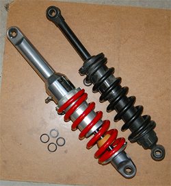 | Product Comments: Very nicely made shock absorber; looks like custom made. Chromoly steel; rebuildable. Nitrogen gas charged. Comes with cool-looking progressive rate springs in black or red. Internal bladder eliminates need for external reservoir. Five position damping adjustment. Threaded collar adjusts preload but collar is a bit stiff and doesn’t turn easily. Provides excellent ride characteristics and gives very smooth but controlled ride. Gives the bike’s rear end a “silky buttery” feel without wallowing. | |