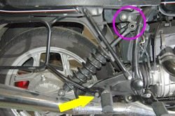 I found that it was only necessary to remove a single bolt (yellow arrow, photo left) from the lower saddlebag mounting rail, which provide enough play for the old shock to be removed and to install the new one.