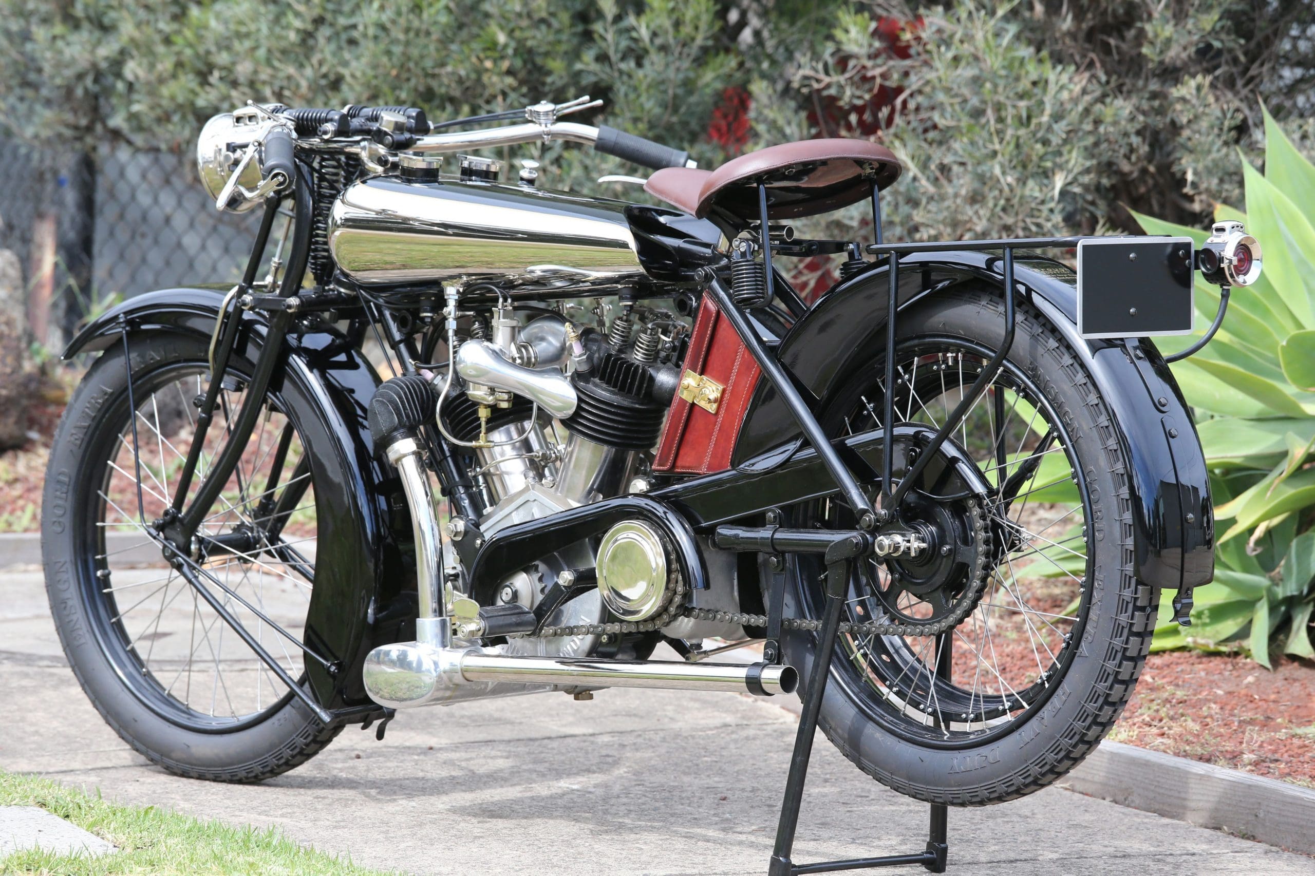 The Brough Superior Mark 1’s V-twin 1,000cc engine could be ordered with the overhead-valve JAP 90-Bore engine or the Swiss M.A.G. inlet-over-exhaust (F-head) motor. The model you see here has the JAP 90-Bore. That engine was a racing design and an early example of an overhead-valve V-twin.
