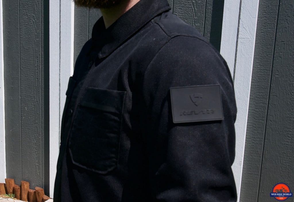 These include the REV’IT! logo on the shoulder, which for some reason is a velcro badge that you can actually remove. If you do, there’s just a big empty black square there, so it looks kind of silly.